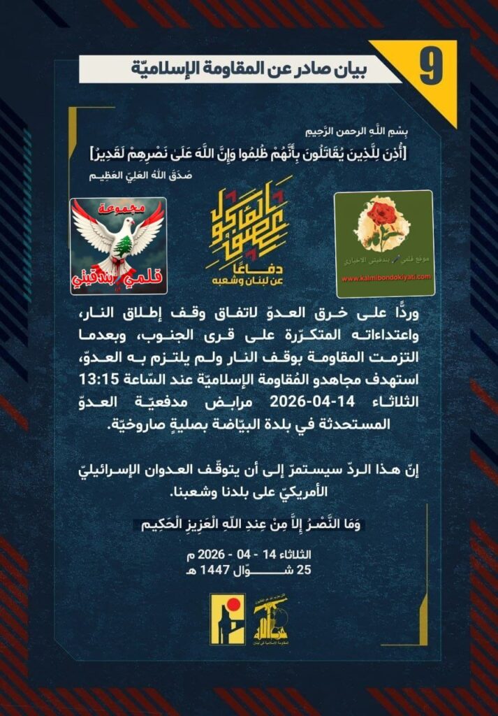 ๐Ÿ›‘ุตุฏุฑ ุจูŠุงู† ุฑู‚ู… (9) ู„ู„ู…ู‚ุงูˆู…ุฉ ุงู„ุงุณู„ุงู…ูŠุฉ ุงู„ุขุชูŠ ู†ุตู‡:”ุฏูุงุนู‹ุง ุนู† ู„ุจู†ุงู† ูˆุดุนุจู‡ุŒ ูˆุฑุฏู‘ู‹ุง ุนู„ู‰ ุฎุฑู‚ ุงู„ุนุฏูˆู‘ ู„ุงุชูุงู‚ ูˆู‚ู ุฅุทู„ุงู‚ ุงู„ู†ุงุฑุŒ ูˆุงุนุชุฏุงุกุงุชู‡ ุงู„ู…ุชูƒุฑู‘ุฑุฉ ุนู„ู‰ ู‚ุฑู‰ ุงู„ุฌู†ูˆุจุŒ ูˆุจุนุฏู…ุง ุงู„ุชุฒู…ุช ุงู„ู…ู‚ุงูˆู…ุฉ ุจูˆู‚ู ุงู„ู†ุงุฑ ูˆู„ู… ูŠู„ุชุฒู… ุจู‡ ุงู„ุนุฏูˆู‘ุŒ ุงุณุชู‡ุฏู ู…ุฌุงู‡ุฏูˆ ุงู„ู…ูู‚ุงูˆู…ุฉ ุงู„ุฅุณู„ุงู…ูŠู‘ุฉ ุนู†ุฏ ุงู„ุณู‘ุงุนุฉ 13:15 ุงู„ุซู„ุงุซุงุก 14-04-2026 ู…ุฑุงุจุถ ู…ุฏูุนูŠู‘ุฉ ุงู„ุนุฏูˆู‘ ุงู„ู…ุณุชุญุฏุซุฉ ููŠ ุจู„ุฏุฉ ุงู„ุจูŠู‘ุงุถุฉ ุจุตู„ูŠุฉู ุตุงุฑูˆุฎูŠู‘ุฉ.ุฅู†ู‘ ู‡ุฐุง ุงู„ุฑุฏู‘ ุณูŠุณุชู…ุฑู‘ ุฅู„ู‰ ุฃู† ูŠุชูˆู‚ู‘ู ุงู„ุนุฏูˆุงู† ุงู„ุฅุณุฑุงุฆูŠู„ูŠู‘ ุงู„ุฃู…ุฑูŠูƒูŠู‘ ุนู„ู‰ ุจู„ุฏู†ุง ูˆุดุนุจู†ุง.