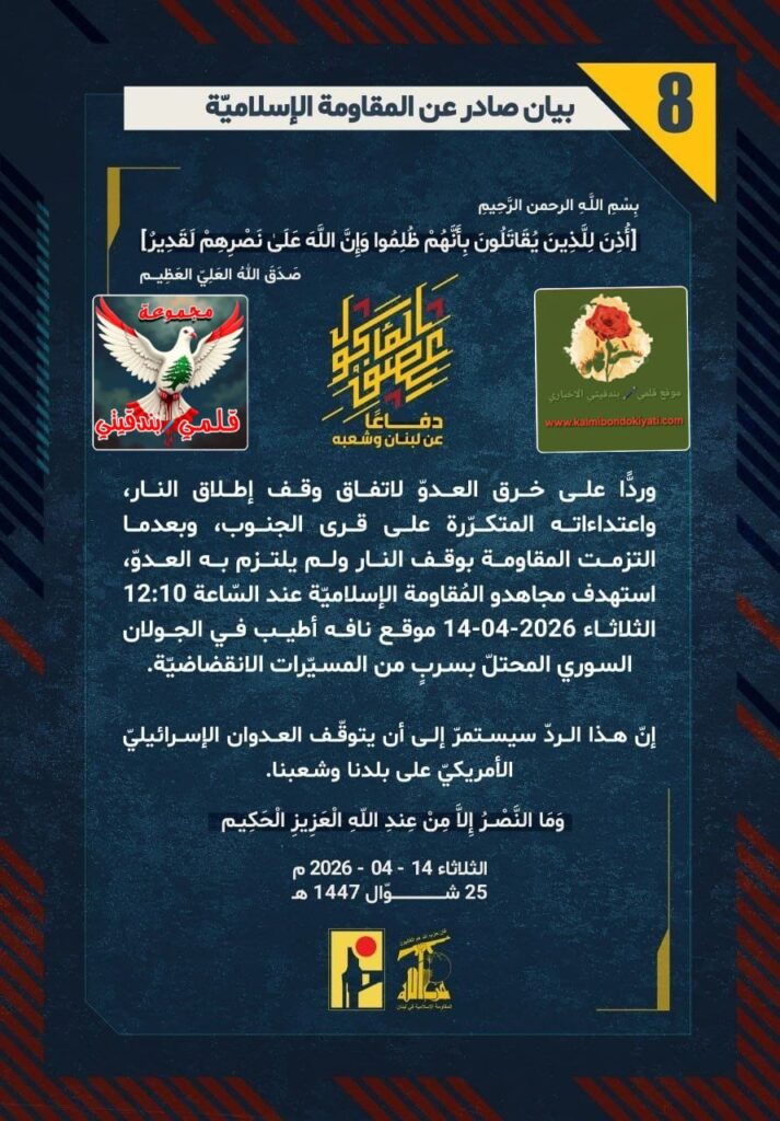 โ€‹๐Ÿ›‘ ุตุฏุฑ ุจูŠุงู† ุฑู‚ู… (8) ู„ู„ู…ู‚ุงูˆู…ุฉ ุงู„ุฅุณู„ุงู…ูŠุฉ ุงู„ุขุชูŠ ู†ุตู‡:”ุฏูุงุนู‹ุง ุนู† ู„ุจู†ุงู† ูˆุดุนุจู‡ุŒ ูˆุฑุฏู‘ู‹ุง ุนู„ู‰ ุฎุฑู‚ ุงู„ุนุฏูˆู‘ ู„ุงุชูุงู‚ ูˆู‚ู ุฅุทู„ุงู‚ ุงู„ู†ุงุฑุŒ ูˆุงุนุชุฏุงุกุงุชู‡ ุงู„ู…ุชูƒุฑู‘ุฑุฉ ุนู„ู‰ ู‚ุฑู‰ ุงู„ุฌู†ูˆุจุŒ ูˆุจุนุฏู…ุง ุงู„ุชุฒู…ุช ุงู„ู…ู‚ุงูˆู…ุฉ ุจูˆู‚ู ุงู„ู†ุงุฑ ูˆู„ู… ูŠู„ุชุฒู… ุจู‡ ุงู„ุนุฏูˆู‘ุŒ ุงุณุชู‡ุฏู ู…ุฌุงู‡ุฏูˆ ุงู„ู…ูู‚ุงูˆู…ุฉ ุงู„ุฅุณู„ุงู…ูŠู‘ุฉ ุนู†ุฏ ุงู„ุณู‘ุงุนุฉ 12:10 ุงู„ุซู„ุงุซุงุก 14-04-2026 ู…ูˆู‚ุน ู†ุงูู‡ ุฃุทูŠุจ ููŠ ุงู„ุฌูˆู„ุงู† ุงู„ุณูˆุฑูŠ ุงู„ู…ุญุชู„ู‘ ุจุณุฑุจู ู…ู† ุงู„ู…ุณูŠู‘ุฑุงุช ุงู„ุงู†ู‚ุถุงุถูŠู‘ุฉ. ุฅู†ู‘ ู‡ุฐุง ุงู„ุฑุฏู‘ ุณูŠุณุชู…ุฑู‘ ุฅู„ู‰ ุฃู† ูŠุชูˆู‚ู‘ู ุงู„ุนุฏูˆุงู† ุงู„ุฅุณุฑุงุฆูŠู„ูŠู‘ ุงู„ุฃู…ุฑูŠูƒูŠู‘ ุนู„ู‰ ุจู„ุฏู†ุง ูˆุดุนุจู†ุง.”