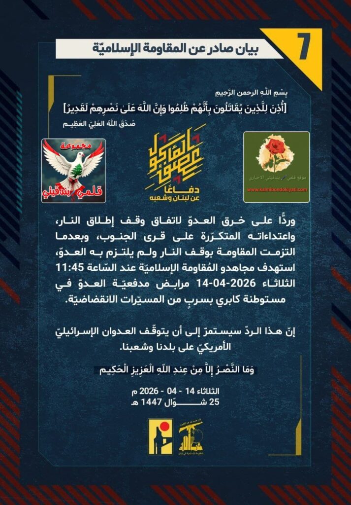 โ€‹๐Ÿ›‘ ุตุฏุฑ ุจูŠุงู† ุฑู‚ู… (7) ู„ู„ู…ู‚ุงูˆู…ุฉ ุงู„ุฅุณู„ุงู…ูŠุฉ ุงู„ุขุชูŠ ู†ุตู‡:”ุฏูุงุนู‹ุง ุนู† ู„ุจู†ุงู† ูˆุดุนุจู‡ุŒ ูˆุฑุฏู‘ู‹ุง ุนู„ู‰ ุฎุฑู‚ ุงู„ุนุฏูˆู‘ ู„ุงุชูุงู‚ ูˆู‚ู ุฅุทู„ุงู‚ ุงู„ู†ุงุฑุŒ ูˆุงุนุชุฏุงุกุงุชู‡ ุงู„ู…ุชูƒุฑู‘ุฑุฉ ุนู„ู‰ ู‚ุฑู‰ ุงู„ุฌู†ูˆุจุŒ ูˆุจุนุฏู…ุง ุงู„ุชุฒู…ุช ุงู„ู…ู‚ุงูˆู…ุฉ ุจูˆู‚ู ุงู„ู†ุงุฑ ูˆู„ู… ูŠู„ุชุฒู… ุจู‡ ุงู„ุนุฏูˆู‘ุŒ ุงุณุชู‡ุฏู ู…ุฌุงู‡ุฏูˆ ุงู„ู…ูู‚ุงูˆู…ุฉ ุงู„ุฅุณู„ุงู…ูŠู‘ุฉ ุนู†ุฏ ุงู„ุณู‘ุงุนุฉ 11:45 ุงู„ุซู„ุงุซุงุก 14-04-2026 ู…ุฑุงุจุถ ู…ุฏูุนูŠู‘ุฉ ุงู„ุนุฏูˆู‘ ููŠ ู…ุณุชูˆุทู†ุฉ ูƒุงุจุฑูŠ ุจุณุฑุจู ู…ู† ุงู„ู…ุณูŠู‘ุฑุงุช ุงู„ุงู†ู‚ุถุงุถูŠู‘ุฉ. ุฅู†ู‘ ู‡ุฐุง ุงู„ุฑุฏู‘ ุณูŠุณุชู…ุฑู‘ ุฅู„ู‰ ุฃู† ูŠุชูˆู‚ู‘ู ุงู„ุนุฏูˆุงู† ุงู„ุฅุณุฑุงุฆูŠู„ูŠู‘ ุงู„ุฃู…ุฑูŠูƒูŠู‘ ุนู„ู‰ ุจู„ุฏู†ุง ูˆุดุนุจู†ุง.”