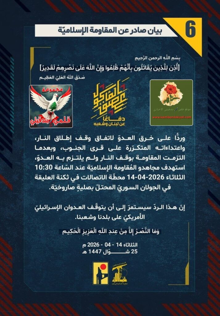 โ€‹๐Ÿ›‘ ุตุฏุฑ ุจูŠุงู† ุฑู‚ู… (6) ู„ู„ู…ู‚ุงูˆู…ุฉ ุงู„ุฅุณู„ุงู…ูŠุฉ ุงู„ุขุชูŠ ู†ุตู‡:”ุฏูุงุนู‹ุง ุนู† ู„ุจู†ุงู† ูˆุดุนุจู‡ุŒ ูˆุฑุฏู‘ู‹ุง ุนู„ู‰ ุฎุฑู‚ ุงู„ุนุฏูˆู‘ ู„ุงุชูุงู‚ ูˆู‚ู ุฅุทู„ุงู‚ ุงู„ู†ุงุฑุŒ ูˆุงุนุชุฏุงุกุงุชู‡ ุงู„ู…ุชูƒุฑู‘ุฑุฉ ุนู„ู‰ ู‚ุฑู‰ ุงู„ุฌู†ูˆุจุŒ ูˆุจุนุฏู…ุง ุงู„ุชุฒู…ุช ุงู„ู…ู‚ุงูˆู…ุฉ ุจูˆู‚ู ุงู„ู†ุงุฑ ูˆู„ู… ูŠู„ุชุฒู… ุจู‡ ุงู„ุนุฏูˆู‘ุŒ ุงุณุชู‡ุฏู ู…ุฌุงู‡ุฏูˆ ุงู„ู…ูู‚ุงูˆู…ุฉ ุงู„ุฅุณู„ุงู…ูŠู‘ุฉ ุนู†ุฏ ุงู„ุณู‘ุงุนุฉ 10:30 ุงู„ุซู„ุงุซุงุก 14-04-2026 ู…ุญุทู‘ุฉ ุงู„ุงุชุตุงู„ุงุช ููŠ ุซูƒู†ุฉ โ€ุงู„ุนู„ูŠู‚ุฉ ููŠ ุงู„ุฌูˆู„ุงู† ุงู„ุณูˆุฑูŠู‘ ุงู„ู…ุญุชู„ู‘ ุจุตู„ูŠุฉู ุตุงุฑูˆุฎูŠู‘ุฉ. ุฅู†ู‘ ู‡ุฐุง ุงู„ุฑุฏู‘ ุณูŠุณุชู…ุฑู‘ ุฅู„ู‰ ุฃู† ูŠุชูˆู‚ู‘ู ุงู„ุนุฏูˆุงู† ุงู„ุฅุณุฑุงุฆูŠู„ูŠู‘ ุงู„ุฃู…ุฑูŠูƒูŠู‘ ุนู„ู‰ ุจู„ุฏู†ุง ูˆุดุนุจู†ุง.”