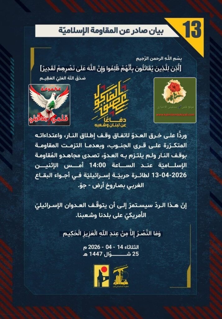 🛑صدر بيان رقم (13) للمقاومة الاسلامية الآتي نصه:”دفاعًا عن لبنان وشعبه، وردًّا على خرق العدوّ لاتفاق وقف إطلاق النار، واعتداءاته المتكرّرة على قرى الجنوب، وبعدما التزمت المقاومة بوقف النار ولم يلتزم به العدوّ، تصدى مجاهدو المُقاومة الإسلاميّة عند الساعة 14:00 أمس الإثنين 13-04-2026 لطائرة حربيّة إسرائيليّة في أجواء البقاع الغربي بصاروخ أرض – جوّ.إنّ هذا الردّ سيستمرّ إلى أن يتوقّف العدوان الإسرائيليّ الأمريكيّ على بلدنا وشعبنا.