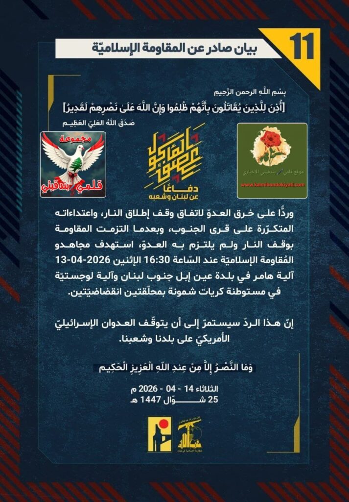​🛑 صدر بيان رقم (11) للمقاومة الإسلامية الآتي نصه:”دفاعًا عن لبنان وشعبه، وردًّا على خرق العدوّ لاتفاق وقف إطلاق النار، واعتداءاته المتكرّرة على قرى الجنوب، وبعدما التزمت المقاومة بوقف النار ولم يلتزم به العدوّ، استهدف مجاهدو المُقاومة الإسلاميّة عند السّاعة 16:30 الإثنين 13-04-2026 آلية هامر في بلدة عين إبل جنوب لبنان وآلية لوجستيّة في مستوطنة كريات شمونة بمحلّقتين انقضاضيّتين. إنّ هذا الردّ سيستمرّ إلى أن يتوقّف العدوان الإسرائيليّ الأمريكيّ على بلدنا وشعبنا.”