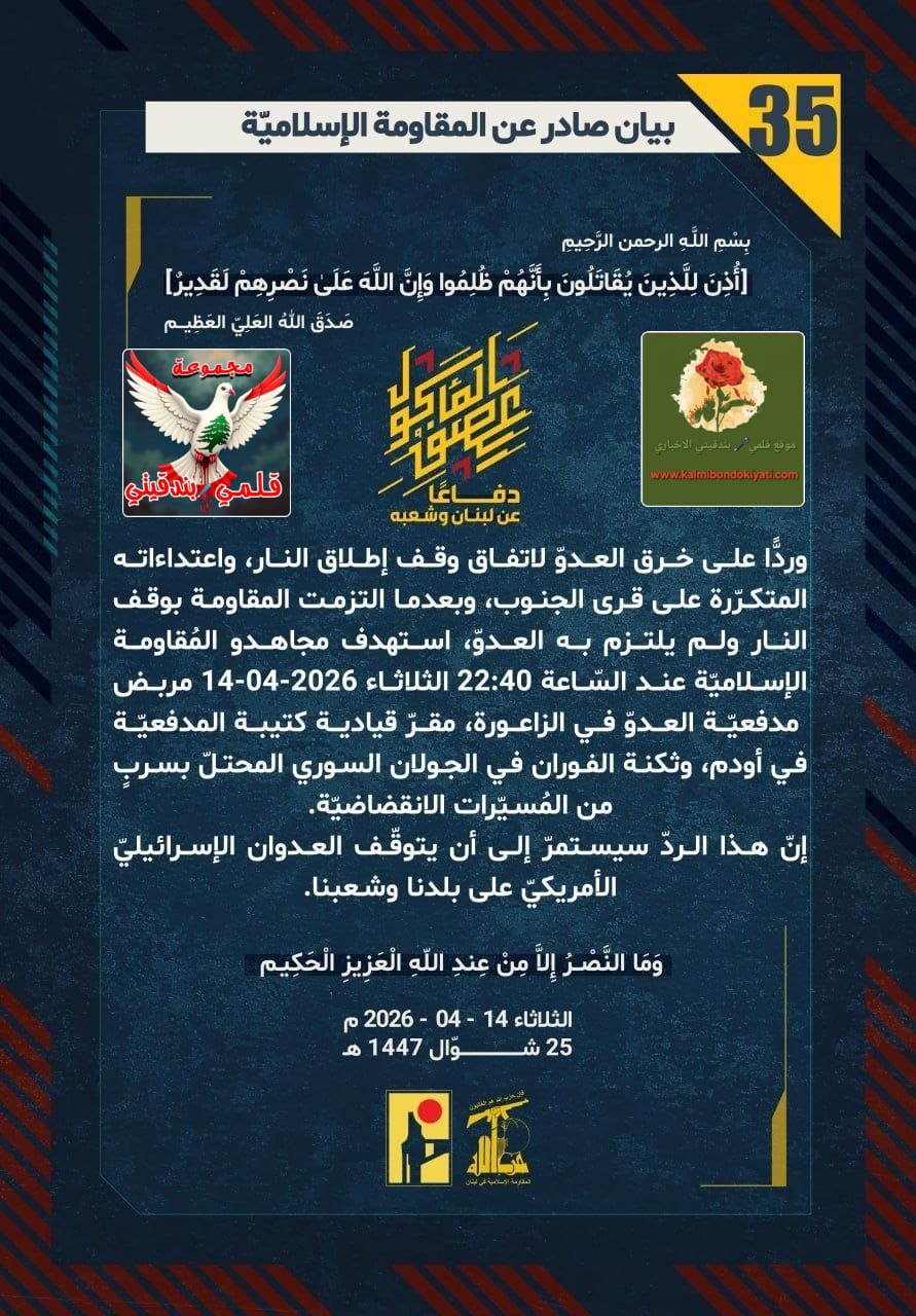 ๐ุตุฏุฑ ุจูุงู ุฑูู (35) ููู ูุงูู ุฉ ุงูุงุณูุงู ูุฉ ุงูุขุชู ูุตู:”ุฏูุงุนูุง ุนู ูุจูุงู ูุดุนุจูุ ูุฑุฏููุง ุนูู ุฎุฑู ุงูุนุฏูู ูุงุชูุงู ููู ุฅุทูุงู ุงููุงุฑุ ูุงุนุชุฏุงุกุงุชู ุงูู ุชูุฑูุฑุฉ ุนูู ูุฑู ุงูุฌููุจุ ูุจุนุฏู ุง ุงูุชุฒู ุช ุงูู ูุงูู ุฉ ุจููู ุงููุงุฑ ููู ููุชุฒู ุจู ุงูุนุฏููุ ุงุณุชูุฏู ู ุฌุงูุฏู ุงูู ููุงูู ุฉ ุงูุฅุณูุงู ููุฉ ุนูุฏ ุงูุณูุงุนุฉ 22:40 ุงูุซูุงุซุงุก 14-04-2026 ู ุฑุจุถ ู ุฏูุนููุฉ ุงูุนุฏูู ูู ุงูุฒุงุนูุฑุฉุ ู ูุฑู ููุงุฏูุฉ ูุชูุจุฉ ุงูู ุฏูุนููุฉ ูู ุฃูุฏู ุ ูุซููุฉ ุงูููุฑุงู ูู ุงูุฌููุงู ุงูุณูุฑู ุงูู ุญุชูู ุจุณุฑุจู ู ู ุงูู ูุณููุฑุงุช ุงูุงููุถุงุถููุฉ.ุฅูู ูุฐุง ุงูุฑุฏู ุณูุณุชู ุฑู ุฅูู ุฃู ูุชูููู ุงูุนุฏูุงู ุงูุฅุณุฑุงุฆูููู ุงูุฃู ุฑูููู ุนูู ุจูุฏูุง ูุดุนุจูุง.