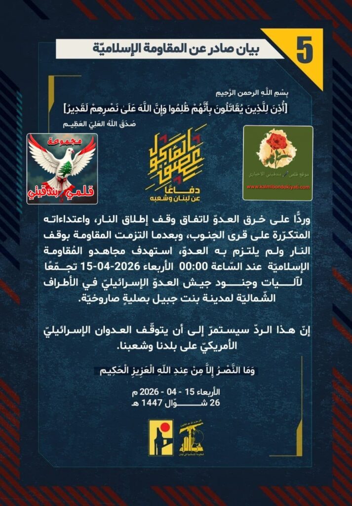 โ๐ ุตุฏุฑ ุจูุงู ุฑูู (5) ููู ูุงูู ุฉ ุงูุฅุณูุงู ูุฉ ุงูุขุชู ูุตู:”ุฏูุงุนูุง ุนู ูุจูุงู ูุดุนุจูุ ูุฑุฏููุง ุนูู ุฎุฑู ุงูุนุฏูู ูุงุชูุงู ููู ุฅุทูุงู ุงููุงุฑุ ูุงุนุชุฏุงุกุงุชู ุงูู ุชูุฑูุฑุฉ ุนูู ูุฑู ุงูุฌููุจุ ูุจุนุฏู ุง ุงูุชุฒู ุช ุงูู ูุงูู ุฉ ุจููู ุงููุงุฑ ููู ููุชุฒู ุจู ุงูุนุฏููุ ุงุณุชูุฏู ู ุฌุงูุฏู ุงูู ููุงูู ุฉ ุงูุฅุณูุงู ููุฉ ุนูุฏ ุงูุณูุงุนุฉ 00:00 ุงูุฃุฑุจุนุงุก 15-04-2026 ุชุฌู ูุนูุง ูุขููุงุช ูุฌููุฏ ุฌูุด ุงูุนุฏูู ุงูุฅุณุฑุงุฆูููู ูู ุงูุฃุทุฑุงู ุงูุดูู ุงูููุฉ ูู ุฏููุฉ ุจูุช ุฌุจูู ุจุตููุฉู ุตุงุฑูุฎููุฉ. ุฅูู ูุฐุง ุงูุฑุฏู ุณูุณุชู ุฑู ุฅูู ุฃู ูุชูููู ุงูุนุฏูุงู ุงูุฅุณุฑุงุฆูููู ุงูุฃู ุฑูููู ุนูู ุจูุฏูุง ูุดุนุจูุง.”
