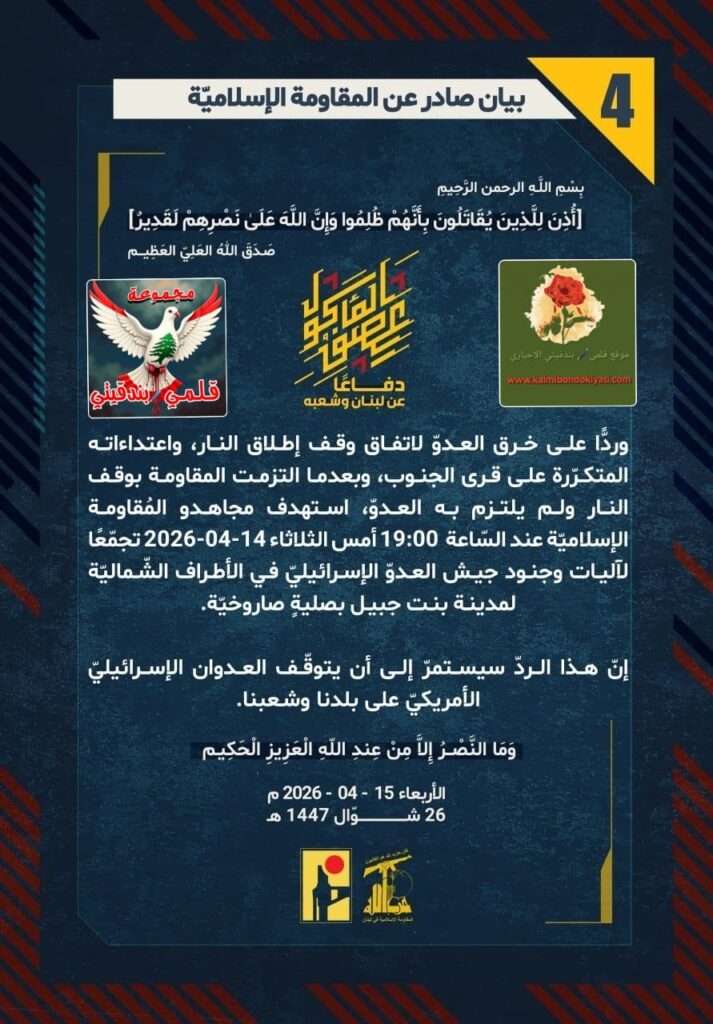 โ๐ ุตุฏุฑ ุจูุงู ุฑูู (4) ููู ูุงูู ุฉ ุงูุฅุณูุงู ูุฉ ุงูุขุชู ูุตู:”ุฏูุงุนูุง ุนู ูุจูุงู ูุดุนุจูุ ูุฑุฏููุง ุนูู ุฎุฑู ุงูุนุฏูู ูุงุชูุงู ููู ุฅุทูุงู ุงููุงุฑุ ูุงุนุชุฏุงุกุงุชู ุงูู ุชูุฑูุฑุฉ ุนูู ูุฑู ุงูุฌููุจุ ูุจุนุฏู ุง ุงูุชุฒู ุช ุงูู ูุงูู ุฉ ุจููู ุงููุงุฑ ููู ููุชุฒู ุจู ุงูุนุฏููุ ุงุณุชูุฏู ู ุฌุงูุฏู ุงูู ููุงูู ุฉ ุงูุฅุณูุงู ููุฉ ุนูุฏ ุงูุณูุงุนุฉ 19:00 ุฃู ุณ ุงูุซูุงุซุงุก 14-04-2026 ุชุฌู ูุนูุง ูุขููุงุช ูุฌููุฏ ุฌูุด ุงูุนุฏูู ุงูุฅุณุฑุงุฆูููู ูู ุงูุฃุทุฑุงู ุงูุดูู ุงูููุฉ ูู ุฏููุฉ ุจูุช ุฌุจูู ุจุตููุฉู ุตุงุฑูุฎููุฉ. ุฅูู ูุฐุง ุงูุฑุฏู ุณูุณุชู ุฑู ุฅูู ุฃู ูุชูููู ุงูุนุฏูุงู ุงูุฅุณุฑุงุฆูููู ุงูุฃู ุฑูููู ุนูู ุจูุฏูุง ูุดุนุจูุง.”