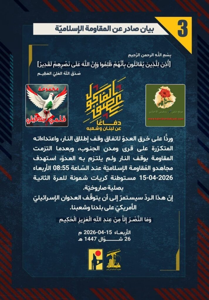 โ๐ ุตุฏุฑ ุจูุงู ุฑูู (3) ููู ูุงูู ุฉ ุงูุฅุณูุงู ูุฉ ุงูุขุชู ูุตู:”ุฏูุงุนูุง ุนู ูุจูุงู ูุดุนุจูุ ูุฑุฏููุง ุนูู ุฎุฑู ุงูุนุฏูู ูุงุชูุงู ููู ุฅุทูุงู ุงููุงุฑุ ูุงุนุชุฏุงุกุงุชู ุงูู ุชูุฑูุฑุฉ ุนูู ูุฑู ูู ุฏู ุงูุฌููุจุ ูุจุนุฏู ุง ุงูุชุฒู ุช ุงูู ูุงูู ุฉ ุจููู ุงููุงุฑ ููู ููุชุฒู ุจู ุงูุนุฏููุ ุงุณุชูุฏู ู ุฌุงูุฏู ุงูู ููุงูู ุฉ ุงูุฅุณูุงู ููุฉ ุนูุฏ ุงูุณูุงุนุฉ 08:55 ุงูุฃุฑุจุนุงุก 15-04-2026 ู ุณุชูุทูุฉ ูุฑูุงุช ุดู ููุฉ ููู ุฑุฉ ุงูุซุงููุฉ ุจุตููุฉ ุตุงุฑูุฎููุฉ. ุฅูู ูุฐุง ุงูุฑุฏู ุณูุณุชู ุฑู ุฅูู ุฃู ูุชูููู ุงูุนุฏูุงู ุงูุฅุณุฑุงุฆูููู ุงูุฃู ุฑูููู ุนูู ุจูุฏูุง ูุดุนุจูุง.”