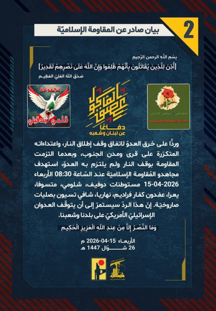 โ๐ ุตุฏุฑ ุจูุงู ุฑูู (2) ููู ูุงูู ุฉ ุงูุฅุณูุงู ูุฉ ุงูุขุชู ูุตู:”ุฏูุงุนูุง ุนู ูุจูุงู ูุดุนุจูุ ูุฑุฏููุง ุนูู ุฎุฑู ุงูุนุฏูู ูุงุชูุงู ููู ุฅุทูุงู ุงููุงุฑุ ูุงุนุชุฏุงุกุงุชู ุงูู ุชูุฑูุฑุฉ ุนูู ูุฑู ูู ุฏู ุงูุฌููุจุ ูุจุนุฏู ุง ุงูุชุฒู ุช ุงูู ูุงูู ุฉ ุจููู ุงููุงุฑ ููู ููุชุฒู ุจู ุงูุนุฏููุ ุงุณุชูุฏู ู ุฌุงูุฏู ุงูู ููุงูู ุฉ ุงูุฅุณูุงู ููุฉ ุนูุฏ ุงูุณูุงุนุฉ 08:30 ุงูุฃุฑุจุนุงุก 15-04-2026 ู ุณุชูุทูุงุช ุฏููููุ ุดููู ูุ ู ุชุณููุงุ ูุนุฑุงุ ุนูุฏูู ููุงุฑ ูุฑุงุฏูู ุ ููุงุฑูุงุ ุดุงูู ุชุณููู ุจุตููุงุช ุตุงุฑูุฎููุฉ. ุฅูู ูุฐุง ุงูุฑุฏู ุณูุณุชู ุฑู ุฅูู ุฃู ูุชูููู ุงูุนุฏูุงู ุงูุฅุณุฑุงุฆูููู ุงูุฃู ุฑูููู ุนูู ุจูุฏูุง ูุดุนุจูุง.”
