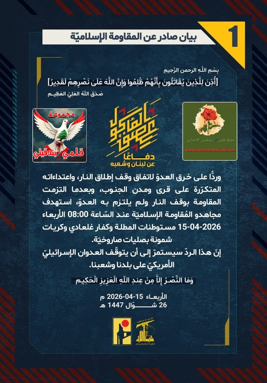 โ๐ ุตุฏุฑ ุจูุงู ุฑูู (1) ููู ูุงูู ุฉ ุงูุฅุณูุงู ูุฉ ุงูุขุชู ูุตู:”ุฏูุงุนูุง ุนู ูุจูุงู ูุดุนุจูุ ูุฑุฏููุง ุนูู ุฎุฑู ุงูุนุฏูู ูุงุชูุงู ููู ุฅุทูุงู ุงููุงุฑุ ูุงุนุชุฏุงุกุงุชู ุงูู ุชูุฑูุฑุฉ ุนูู ูุฑู ูู ุฏู ุงูุฌููุจุ ูุจุนุฏู ุง ุงูุชุฒู ุช ุงูู ูุงูู ุฉ ุจููู ุงููุงุฑ ููู ููุชุฒู ุจู ุงูุนุฏููุ ุงุณุชูุฏู ู ุฌุงูุฏู ุงูู ููุงูู ุฉ ุงูุฅุณูุงู ููุฉ ุนูุฏ ุงูุณูุงุนุฉ 08:00 ุงูุฃุฑุจุนุงุก 15-04-2026 ู ุณุชูุทูุงุช ุงูู ุทูุฉ ูููุงุฑ ุฌูุนุงุฏู ููุฑูุงุช ุดู ููุฉ ุจุตููุงุช ุตุงุฑูุฎููุฉ. ุฅูู ูุฐุง ุงูุฑุฏู ุณูุณุชู ุฑู ุฅูู ุฃู ูุชูููู ุงูุนุฏูุงู ุงูุฅุณุฑุงุฆูููู ุงูุฃู ุฑูููู ุนูู ุจูุฏูุง ูุดุนุจูุง.”