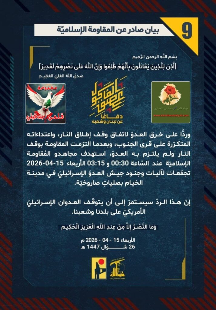 โ๐ ุตุฏุฑ ุจูุงู ุฑูู (9) ููู ูุงูู ุฉ ุงูุฅุณูุงู ูุฉ ุงูุขุชู ูุตู:”ุฏูุงุนูุง ุนู ูุจูุงู ูุดุนุจูุ ูุฑุฏููุง ุนูู ุฎุฑู ุงูุนุฏูู ูุงุชูุงู ููู ุฅุทูุงู ุงููุงุฑุ ูุงุนุชุฏุงุกุงุชู ุงูู ุชูุฑูุฑุฉ ุนูู ูุฑู ุงูุฌููุจุ ูุจุนุฏู ุง ุงูุชุฒู ุช ุงูู ูุงูู ุฉ ุจููู ุงููุงุฑ ููู ููุชุฒู ุจู ุงูุนุฏููุ ุงุณุชูุฏู ู ุฌุงูุฏู ุงูู ููุงูู ุฉ ุงูุฅุณูุงู ููุฉ ุนูุฏ ุงูุณูุงุนุฉ 00:30 ู 03:15 ุงูุฃุฑุจุนุงุก 15-04-2026 ุชุฌู ูุนุงุช ูุขููุงุช ูุฌููุฏ ุฌูุด ุงูุนุฏูู ุงูุฅุณุฑุงุฆูููู ูู ู ุฏููุฉ ุงูุฎูุงู ุจุตููุงุชู ุตุงุฑูุฎููุฉ. ุฅูู ูุฐุง ุงูุฑุฏู ุณูุณุชู ุฑู ุฅูู ุฃู ูุชูููู ุงูุนุฏูุงู ุงูุฅุณุฑุงุฆูููู ุงูุฃู ุฑูููู ุนูู ุจูุฏูุง ูุดุนุจูุง.”
