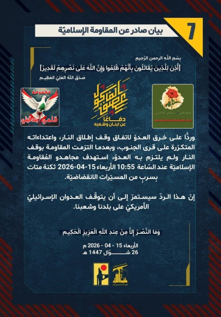 โ๐ ุตุฏุฑ ุจูุงู ุฑูู (7) ููู ูุงูู ุฉ ุงูุฅุณูุงู ูุฉ ุงูุขุชู ูุตู:”ุฏูุงุนูุง ุนู ูุจูุงู ูุดุนุจูุ ูุฑุฏููุง ุนูู ุฎุฑู ุงูุนุฏูู ูุงุชูุงู ููู ุฅุทูุงู ุงููุงุฑุ ูุงุนุชุฏุงุกุงุชู ุงูู ุชูุฑูุฑุฉ ุนูู ูุฑู ุงูุฌููุจุ ูุจุนุฏู ุง ุงูุชุฒู ุช ุงูู ูุงูู ุฉ ุจููู ุงููุงุฑ ููู ููุชุฒู ุจู ุงูุนุฏููุ ุงุณุชูุฏู ู ุฌุงูุฏู ุงูู ููุงูู ุฉ ุงูุฅุณูุงู ููุฉ ุนูุฏ ุงูุณูุงุนุฉ 10:55 ุงูุฃุฑุจุนุงุก 15-04-2026 ุซููุฉ ู ุชุงุช ุจูุณุฑุจู ู ู ุงูู ุณููุฑุงุช ุงูุงููุถุงุถููุฉ. ุฅูู ูุฐุง ุงูุฑุฏู ุณูุณุชู ุฑู ุฅูู ุฃู ูุชูููู ุงูุนุฏูุงู ุงูุฅุณุฑุงุฆูููู ุงูุฃู ุฑูููู ุนูู ุจูุฏูุง ูุดุนุจูุง.”