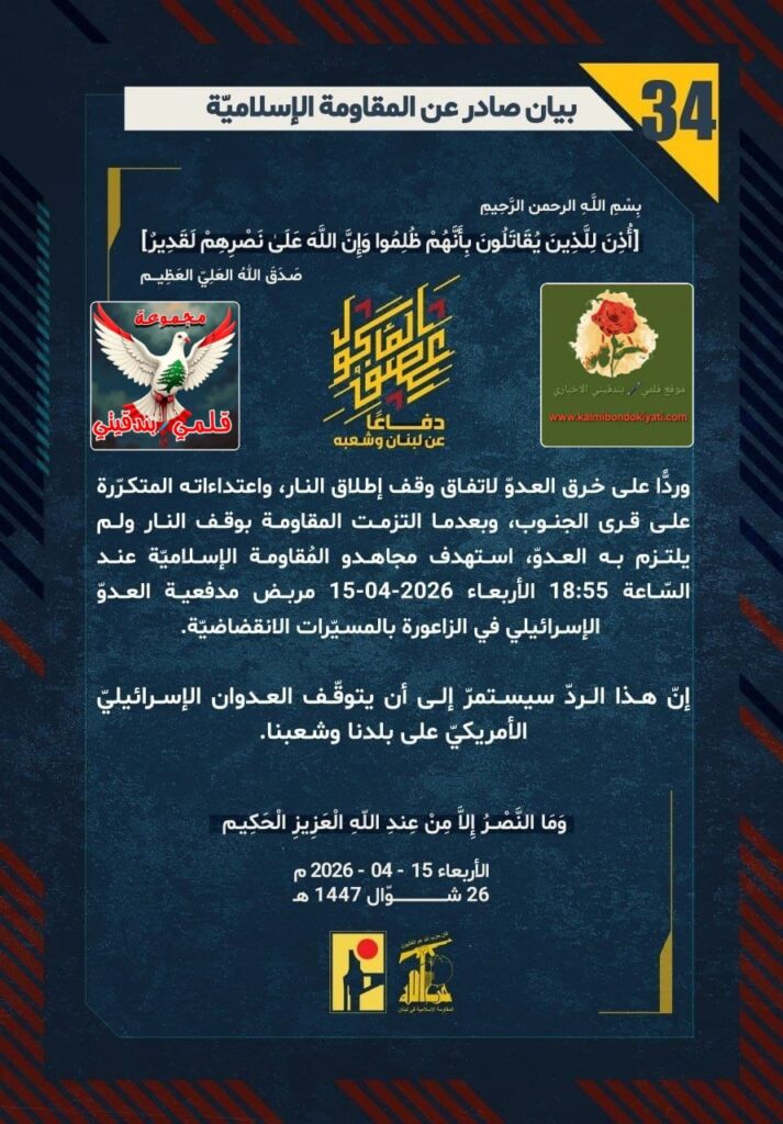 ๐ุฃุตุฏุฑุช ุงูู ูุงูู ุฉ ุงูุงุณูุงู ูุฉ ุจุนุฏ ุงูุจูุงู ุฑูู (33) ู ุจุงุดุฑุฉ ุจูุงู ุฑูู (34) :โุฏูุงุนูุง ุนู ูุจูุงู ูุดุนุจูุ ูุฑุฏููุง ุนูู ุฎุฑู ุงูุนุฏูู ูุงุชูุงู ููู ุฅุทูุงู ุงููุงุฑุ ูุงุนุชุฏุงุกุงุชู ุงูู ุชูุฑูุฑุฉ ุนูู ูุฑู ุงูุฌููุจุ ูุจุนุฏู ุง ุงูุชุฒู ุช ุงูู ูุงูู ุฉ ุจููู ุงููุงุฑ ููู ููุชุฒู ุจู ุงูุนุฏููุ ุงุณุชูุฏู ู ุฌุงูุฏู ุงูู ููุงูู ุฉ ุงูุฅุณูุงู ููุฉ ุนูุฏ ุงูุณูุงุนุฉ 18:55 ุงูุฃุฑุจุนุงุก 15-04-2026 ู ุฑุจุถ ู ุฏูุนูุฉ ุงูุนุฏูู ุงูุฅุณุฑุงุฆููู ูู ุงูุฒุงุนูุฑุฉ ุจุงูู ุณููุฑุงุช ุงูุงููุถุงุถููุฉ. ุฅูู ูุฐุง ุงูุฑุฏู ุณูุณุชู ุฑู ุฅูู ุฃู ูุชูููู ุงูุนุฏูุงู ุงูุฅุณุฑุงุฆูููู ุงูุฃู ุฑูููู ุนูู ุจูุฏูุง ูุดุนุจูุง.