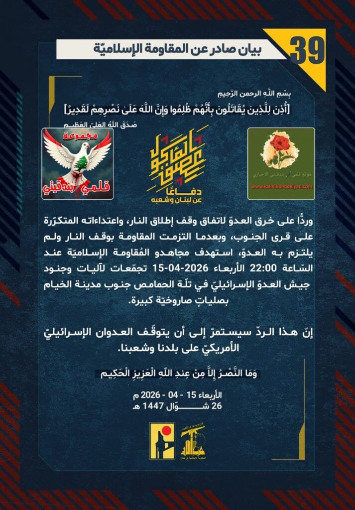 ๐ ุตุฏุฑ ุจูุงู ุฑูู (39) ููู ูุงูู ุฉ ุงูุฅุณูุงู ูุฉ ุงูุขุชู ูุตู: “ุฏูุงุนูุง ุนู ูุจูุงู ูุดุนุจูุ ูุฑุฏููุง ุนูู ุฎุฑู ุงูุนุฏูู ูุงุชูุงู ููู ุฅุทูุงู ุงููุงุฑุ ูุงุนุชุฏุงุกุงุชู ุงูู ุชูุฑูุฑุฉ ุนูู ูุฑู ุงูุฌููุจุ ูุจุนุฏู ุง ุงูุชุฒู ุช ุงูู ูุงูู ุฉ ุจููู ุงููุงุฑ ููู ููุชุฒู ุจู ุงูุนุฏููุ ุงุณุชูุฏู ู ุฌุงูุฏู ุงูู ููุงูู ุฉ ุงูุฅุณูุงู ููุฉ ุนูุฏ ุงูุณูุงุนุฉ 22:00 ุงูุฃุฑุจุนุงุก 15-04-2026 ุชุฌู ูุนุงุช ูุขููุงุช ูุฌููุฏ ุฌูุด ุงูุนุฏูู ุงูุฅุณุฑุงุฆูููู ูู ุชููุฉ ุงูุญู ุงู ุต ุฌููุจ ู ุฏููุฉ ุงูุฎูุงู ุจุตููุงุชู ุตุงุฑูุฎููุฉ ูุจูุฑุฉ. ุฅูู ูุฐุง ุงูุฑุฏู ุณูุณุชู ุฑู ุฅูู ุฃู ูุชูููู ุงูุนุฏูุงู ุงูุฅุณุฑุงุฆูููู ุงูุฃู ุฑูููู ุนูู ุจูุฏูุง ูุดุนุจูุง.”