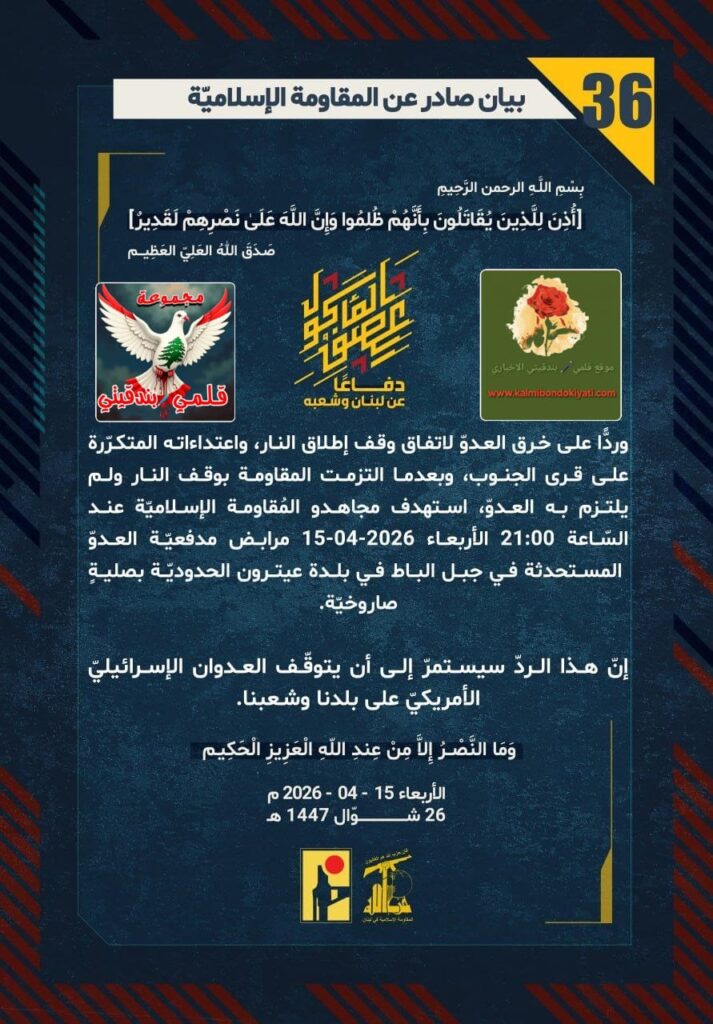โ๐ ุตุฏุฑ ุจูุงู ุฑูู (36) ููู ูุงูู ุฉ ุงูุฅุณูุงู ูุฉ ุงูุขุชู ูุตู: “ุฏูุงุนูุง ุนู ูุจูุงู ูุดุนุจูุ ูุฑุฏููุง ุนูู ุฎุฑู ุงูุนุฏูู ูุงุชูุงู ููู ุฅุทูุงู ุงููุงุฑุ ูุงุนุชุฏุงุกุงุชู ุงูู ุชูุฑูุฑุฉ ุนูู ูุฑู ุงูุฌููุจุ ูุจุนุฏู ุง ุงูุชุฒู ุช ุงูู ูุงูู ุฉ ุจููู ุงููุงุฑ ููู ููุชุฒู ุจู ุงูุนุฏููุ ุงุณุชูุฏู ู ุฌุงูุฏู ุงูู ููุงูู ุฉ ุงูุฅุณูุงู ููุฉ ุนูุฏ ุงูุณูุงุนุฉ 21:00 ุงูุฃุฑุจุนุงุก 15-04-2026 ู ุฑุงุจุถ ู ุฏูุนููุฉ ุงูุนุฏูู ุงูู ุณุชุญุฏุซุฉ ูู ุฌุจู ุงูุจุงุท ูู ุจูุฏุฉ ุนูุชุฑูู ุงูุญุฏูุฏููุฉ ุจุตููุฉู ุตุงุฑูุฎููุฉ. ุฅูู ูุฐุง ุงูุฑุฏู ุณูุณุชู ุฑู ุฅูู ุฃู ูุชูููู ุงูุนุฏูุงู ุงูุฅุณุฑุงุฆูููู ุงูุฃู ุฑูููู ุนูู ุจูุฏูุง ูุดุนุจูุง.”