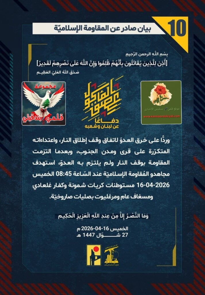 ๐Ÿ›‘ ุตุฏุฑ ุจูŠุงู† ุฑู‚ู… (10) ู„ู„ู…ู‚ุงูˆู…ุฉ ุงู„ุฅุณู„ุงู…ูŠุฉ ุงู„ุขุชูŠ ู†ุตู‡: “ุฏูุงุนู‹ุง ุนู† ู„ุจู†ุงู† ูˆุดุนุจู‡ุŒ ูˆุฑุฏู‘ู‹ุง ุนู„ู‰ ุฎุฑู‚ ุงู„ุนุฏูˆู‘ ู„ุงุชูุงู‚ ูˆู‚ู ุฅุทู„ุงู‚ ุงู„ู†ุงุฑุŒ ูˆุงุนุชุฏุงุกุงุชู‡ ุงู„ู…ุชูƒุฑู‘ุฑุฉ ุนู„ู‰ ู‚ุฑู‰ ูˆู…ุฏู† ุงู„ุฌู†ูˆุจุŒ ูˆุจุนุฏู…ุง ุงู„ุชุฒู…ุช ุงู„ู…ู‚ุงูˆู…ุฉ ุจูˆู‚ู ุงู„ู†ุงุฑ ูˆู„ู… ูŠู„ุชุฒู… ุจู‡ ุงู„ุนุฏูˆู‘ุŒ ุงุณุชู‡ุฏู ู…ุฌุงู‡ุฏูˆ ุงู„ู…ูู‚ุงูˆู…ุฉ ุงู„ุฅุณู„ุงู…ูŠู‘ุฉ ุนู†ุฏ ุงู„ุณู‘ุงุนุฉ 08:45 ุงู„ุฎู…ูŠุณ 16-04-2026 ู…ุณุชูˆุทู†ุงุช ูƒุฑูŠุงุช ุดู…ูˆู†ุฉ ูˆูƒูุงุฑ ุบู„ุนุงุฏูŠ ูˆู…ุณุบุงู ุนุงู… ูˆู…ุฑุบู„ูŠูˆุช ุจุตู„ูŠุงุช ุตุงุฑูˆุฎูŠุฉ. ุฅู†ู‘ ู‡ุฐุง ุงู„ุฑุฏู‘ ุณูŠุณุชู…ุฑู‘ ุฅู„ู‰ ุฃู† ูŠุชูˆู‚ู‘ู ุงู„ุนุฏูˆุงู† ุงู„ุฅุณุฑุงุฆูŠู„ูŠู‘ ุงู„ุฃู…ุฑูŠูƒูŠู‘ ุนู„ู‰ ุจู„ุฏู†ุง ูˆุดุนุจู†ุง.”