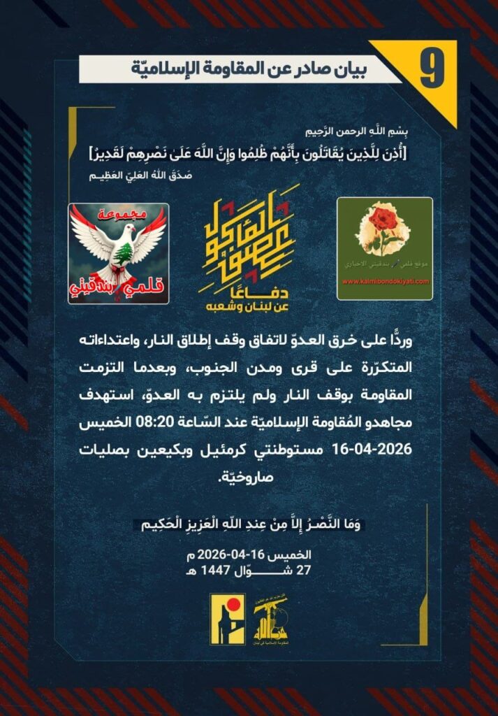 ๐Ÿ›‘ ุตุฏุฑ ุจูŠุงู† ุฑู‚ู… (9) ู„ู„ู…ู‚ุงูˆู…ุฉ ุงู„ุฅุณู„ุงู…ูŠุฉ ุงู„ุขุชูŠ ู†ุตู‡: “ุฏูุงุนู‹ุง ุนู† ู„ุจู†ุงู† ูˆุดุนุจู‡ุŒ ูˆุฑุฏู‘ู‹ุง ุนู„ู‰ ุฎุฑู‚ ุงู„ุนุฏูˆู‘ ู„ุงุชูุงู‚ ูˆู‚ู ุฅุทู„ุงู‚ ุงู„ู†ุงุฑุŒ ูˆุงุนุชุฏุงุกุงุชู‡ ุงู„ู…ุชูƒุฑู‘ุฑุฉ ุนู„ู‰ ู‚ุฑู‰ ูˆู…ุฏู† ุงู„ุฌู†ูˆุจุŒ ูˆุจุนุฏู…ุง ุงู„ุชุฒู…ุช ุงู„ู…ู‚ุงูˆู…ุฉ ุจูˆู‚ู ุงู„ู†ุงุฑ ูˆู„ู… ูŠู„ุชุฒู… ุจู‡ ุงู„ุนุฏูˆู‘ุŒ ุงุณุชู‡ุฏู ู…ุฌุงู‡ุฏูˆ ุงู„ู…ูู‚ุงูˆู…ุฉ ุงู„ุฅุณู„ุงู…ูŠู‘ุฉ ุนู†ุฏ ุงู„ุณู‘ุงุนุฉ 08:20 ุงู„ุฎู…ูŠุณ 16-04-2026 ู…ุณุชูˆุทู†ุชูŠ ูƒุฑู…ุฆูŠู„ ูˆุจูƒูŠุนูŠู† ุจุตู„ูŠุงุช ุตุงุฑูˆุฎูŠุฉ. ุฅู†ู‘ ู‡ุฐุง ุงู„ุฑุฏู‘ ุณูŠุณุชู…ุฑู‘ ุฅู„ู‰ ุฃู† ูŠุชูˆู‚ู‘ู ุงู„ุนุฏูˆุงู† ุงู„ุฅุณุฑุงุฆูŠู„ูŠู‘ ุงู„ุฃู…ุฑูŠูƒูŠู‘ ุนู„ู‰ ุจู„ุฏู†ุง ูˆุดุนุจู†ุง.”