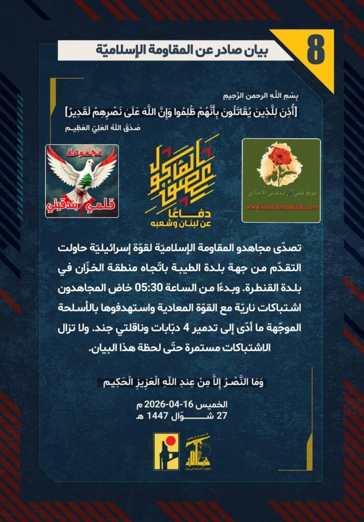 ๐Ÿ›‘ ุตุฏุฑ ุจูŠุงู† ุฑู‚ู… (8) ู„ู„ู…ู‚ุงูˆู…ุฉ ุงู„ุฅุณู„ุงู…ูŠุฉ ุงู„ุขุชูŠ ู†ุตู‡: “ุฏูุงุนู‹ุง ุนู† ู„ุจู†ุงู† ูˆุดุนุจู‡ุŒ ุชุตุฏู‘ู‰ ู…ุฌุงู‡ุฏูˆ ุงู„ู…ู‚ุงูˆู…ุฉ ุงู„ุฅุณู„ุงู…ูŠู‘ุฉ ู„ู‚ูˆู‘ุฉ ุฅุณุฑุงุฆูŠู„ูŠู‘ุฉ ุญุงูˆู„ุช ุงู„ุชู‚ุฏู‘ู… ู…ู† ุฌู‡ุฉ ุจู„ุฏุฉ ุงู„ุทูŠุจุฉ ุจุงุชู‘ุฌุงู‡ ู…ู†ุทู‚ุฉ ุงู„ุฎุฒู‘ุงู† ููŠ ุจู„ุฏุฉ ุงู„ู‚ู†ุทุฑุฉ. ูˆุจุฏุกู‹ุง ู…ู† ุงู„ุณุงุนุฉ 05:30 ุฎุงุถ ุงู„ู…ุฌุงู‡ุฏูˆู† ุงุดุชุจุงูƒุงุช ู†ุงุฑูŠู‘ุฉ ู…ุน ุงู„ู‚ูˆู‘ุฉ ุงู„ู…ุนุงุฏูŠุฉ ูˆุงุณุชู‡ุฏููˆู‡ุง ุจุงู„ุฃุณู„ุญุฉ ุงู„ู…ูˆุฌู‘ู‡ุฉ ู…ุง ุฃุฏู‘ู‰ ุฅู„ู‰ ุชุฏู…ูŠุฑ 4 ุฏุจู‘ุงุจุงุช ูˆู†ุงู‚ู„ุชูŠ ุฌู†ุฏ. ูˆู„ุง ุชุฒุงู„ ุงู„ุงุดุชุจุงูƒุงุช ู…ุณุชู…ุฑุฉ ุญุชู‘ู‰ ู„ุญุธุฉ ู‡ุฐุง ุงู„ุจูŠุงู†. ุฅู†ู‘ ู‡ุฐุง ุงู„ุฑุฏู‘ ุณูŠุณุชู…ุฑู‘ ุฅู„ู‰ ุฃู† ูŠุชูˆู‚ู‘ู ุงู„ุนุฏูˆุงู† ุงู„ุฅุณุฑุงุฆูŠู„ูŠู‘ ุงู„ุฃู…ุฑูŠูƒูŠู‘ ุนู„ู‰ ุจู„ุฏู†ุง ูˆุดุนุจู†ุง.”