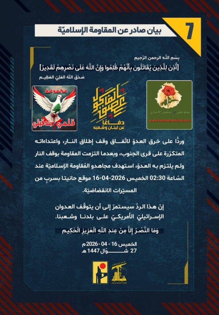 โ€‹๐Ÿ›‘ ุตุฏุฑ ุจูŠุงู† ุฑู‚ู… (7) ู„ู„ู…ู‚ุงูˆู…ุฉ ุงู„ุฅุณู„ุงู…ูŠุฉ ุงู„ุขุชูŠ ู†ุตู‡: “ุฏูุงุนู‹ุง ุนู† ู„ุจู†ุงู† ูˆุดุนุจู‡ุŒ ูˆุฑุฏู‘ู‹ุง ุนู„ู‰ ุฎุฑู‚ ุงู„ุนุฏูˆู‘ ู„ุงุชูุงู‚ ูˆู‚ู ุฅุทู„ุงู‚ ุงู„ู†ุงุฑุŒ ูˆุงุนุชุฏุงุกุงุชู‡ ุงู„ู…ุชูƒุฑู‘ุฑุฉ ุนู„ู‰ ู‚ุฑู‰ ุงู„ุฌู†ูˆุจุŒ ูˆุจุนุฏู…ุง ุงู„ุชุฒู…ุช ุงู„ู…ู‚ุงูˆู…ุฉ ุจูˆู‚ู ุงู„ู†ุงุฑ ูˆู„ู… ูŠู„ุชุฒู… ุจู‡ ุงู„ุนุฏูˆู‘ุŒ ุงุณุชู‡ุฏู ู…ุฌุงู‡ุฏูˆ ุงู„ู…ูู‚ุงูˆู…ุฉ ุงู„ุฅุณู„ุงู…ูŠู‘ุฉ ุนู†ุฏ ุงู„ุณู‘ุงุนุฉ 02:30 ุงู„ุฎู…ูŠุณ 16-04-2026 ู…ูˆู‚ุน ุญุงู†ูŠุชุง ุจุณุฑุจู ู…ู† ุงู„ู…ุณูŠู‘ุฑุงุช ุงู„ุงู†ู‚ุถุงุถูŠู‘ุฉ. ุฅู†ู‘ ู‡ุฐุง ุงู„ุฑุฏู‘ ุณูŠุณุชู…ุฑู‘ ุฅู„ู‰ ุฃู† ูŠุชูˆู‚ู‘ู ุงู„ุนุฏูˆุงู† ุงู„ุฅุณุฑุงุฆูŠู„ูŠู‘ ุงู„ุฃู…ุฑูŠูƒูŠู‘ ุนู„ู‰ ุจู„ุฏู†ุง ูˆุดุนุจู†ุง.”