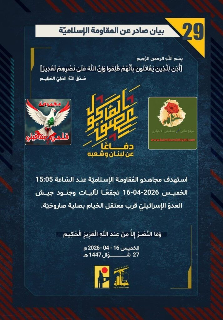 โ๐ ุตุฏุฑ ุจูุงู ุฑูู (29) ููู ูุงูู ุฉ ุงูุฅุณูุงู ูุฉ ุงูุขุชู ูุตู: “ุฏูุงุนูุง ุนู ูุจูุงู ูุดุนุจูุ ุงุณุชูุฏู ู ุฌุงูุฏู ุงูู ููุงูู ุฉ ุงูุฅุณูุงู ููุฉ ุนูุฏ ุงูุณูุงุนุฉ 15:05 ุงูุฎู ูุณ 16-04-2026 ุชุฌู ูุนูุง ูุขููุงุช ูุฌููุฏ ุฌูุด ุงูุนุฏูู ุงูุฅุณุฑุงุฆูููู ูุฑุจ ู ุนุชูู ุงูุฎูุงู ุจุตููุฉ ุตุงุฑูุฎููุฉ.”