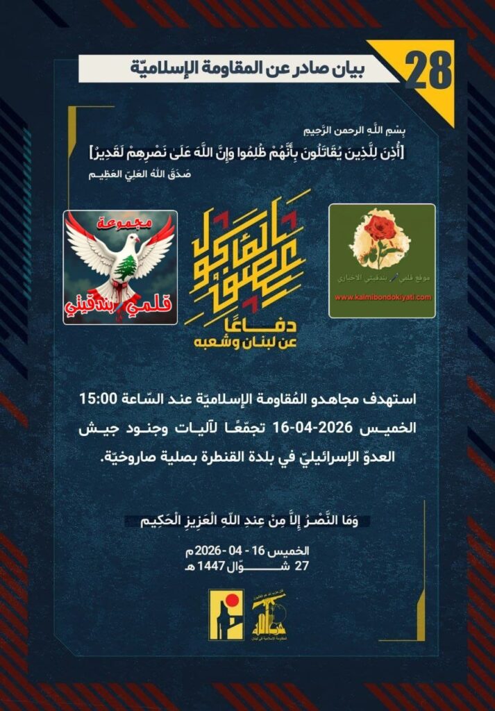โ๐ ุตุฏุฑ ุจูุงู ุฑูู (28) ููู ูุงูู ุฉ ุงูุฅุณูุงู ูุฉ ุงูุขุชู ูุตู: “ุฏูุงุนูุง ุนู ูุจูุงู ูุดุนุจูุ ุงุณุชูุฏู ู ุฌุงูุฏู ุงูู ููุงูู ุฉ ุงูุฅุณูุงู ููุฉ ุนูุฏ ุงูุณูุงุนุฉ 15:00 ุงูุฎู ูุณ 16-04-2026 ุชุฌู ูุนูุง ูุขููุงุช ูุฌููุฏ ุฌูุด ุงูุนุฏูู ุงูุฅุณุฑุงุฆูููู ูู ุจูุฏุฉ ุงูููุทุฑุฉ ุจุตููุฉ ุตุงุฑูุฎููุฉ.”