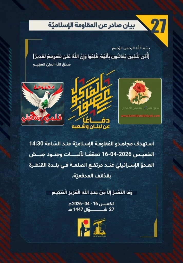 โ๐ ุตุฏุฑ ุจูุงู ุฑูู (27) ููู ูุงูู ุฉ ุงูุฅุณูุงู ูุฉ ุงูุขุชู ูุตู: “ุฏูุงุนูุง ุนู ูุจูุงู ูุดุนุจูุ ุงุณุชูุฏู ู ุฌุงูุฏู ุงูู ููุงูู ุฉ ุงูุฅุณูุงู ููุฉ ุนูุฏ ุงูุณูุงุนุฉ 14:30 ุงูุฎู ูุณ 16-04-2026 ุชุฌู ูุนูุง ูุขููุงุช ูุฌููุฏ ุฌูุด ุงูุนุฏูู ุงูุฅุณุฑุงุฆูููู ุนูุฏ ู ุฑุชูุน ุงูุตูุนุฉ ูู ุจูุฏุฉ ุงูููุทุฑุฉ ุจูุฐุงุฆู ุงูู ุฏูุนููุฉ.”