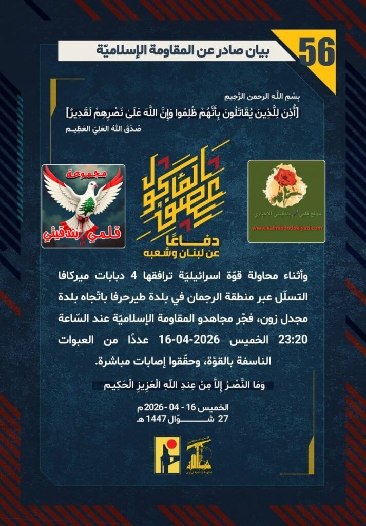 โ๐ ุตุฏุฑ ุจูุงู ุฑูู (56) ููู ูุงูู ุฉ ุงูุฅุณูุงู ูุฉ ุงูุขุชู ูุตู: “ุฏูุงุนูุง ุนู ูุจูุงู ูุดุนุจูุ ูุฃุซูุงุก ู ุญุงููุฉ ูููุฉ ุงุณุฑุงุฆููููุฉ ุชุฑุงูููุง 4 ุฏุจุงุจุงุช ู ูุฑูุงูุง ุงูุชุณููู ุนุจุฑ ู ูุทูุฉ ุงูุฑุฌู ุงู ูู ุจูุฏุฉ ุทูุฑุญุฑูุง ุจุงุชูุฌุงู ุจูุฏุฉ ู ุฌุฏู ุฒููุ ูุฌูุฑ ู ุฌุงูุฏู ุงูู ูุงูู ุฉ ุงูุฅุณูุงู ููุฉ ุนูุฏ ุงูุณูุงุนุฉ 23:20 ุงูุฎู ูุณ 16-04-2026 ุนุฏุฏูุง ู ู ุงูุนุจูุงุช ุงููุงุณูุฉ ุจุงููููุฉุ ูุญููููุง ุฅุตุงุจุงุช ู ุจุงุดุฑุฉ.”
