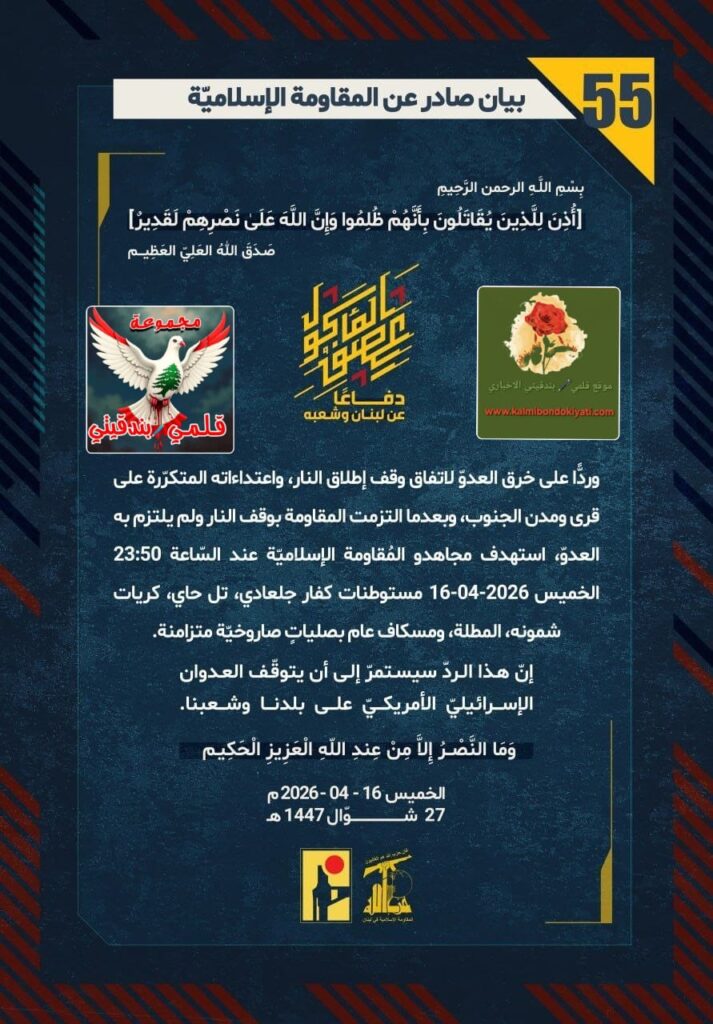 โ๐ ุตุฏุฑ ุจูุงู ุฑูู (55) ููู ูุงูู ุฉ ุงูุฅุณูุงู ูุฉ ุงูุขุชู ูุตู: “ุฏูุงุนูุง ุนู ูุจูุงู ูุดุนุจูุ ูุฑุฏููุง ุนูู ุฎุฑู ุงูุนุฏูู ูุงุชูุงู ููู ุฅุทูุงู ุงููุงุฑุ ูุงุนุชุฏุงุกุงุชู ุงูู ุชูุฑูุฑุฉ ุนูู ูุฑู ูู ุฏู ุงูุฌููุจุ ูุจุนุฏู ุง ุงูุชุฒู ุช ุงูู ูุงูู ุฉ ุจููู ุงููุงุฑ ููู ููุชุฒู ุจู ุงูุนุฏููุ ุงุณุชูุฏู ู ุฌุงูุฏู ุงูู ููุงูู ุฉ ุงูุฅุณูุงู ููุฉ ุนูุฏ ุงูุณูุงุนุฉ 23:50 ุงูุฎู ูุณ 16-04-2026 ู ุณุชูุทูุงุช ููุงุฑ ุฌูุนุงุฏูุ ุชู ุญุงูุ ูุฑูุงุช ุดู ูููุ ุงูู ุทูุฉุ ูู ุณูุงู ุนุงู ุจุตููุงุชู ุตุงุฑูุฎููุฉ ู ุชุฒุงู ูุฉ.”