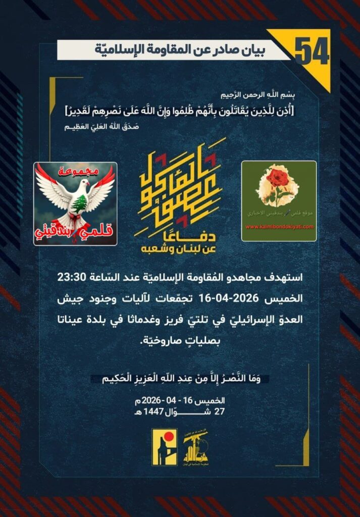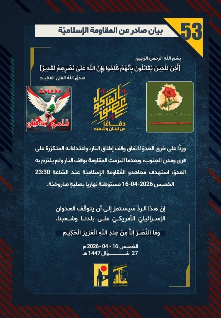 โ๐ ุตุฏุฑ ุจูุงู ุฑูู (53) ููู ูุงูู ุฉ ุงูุฅุณูุงู ูุฉ ุงูุขุชู ูุตู: “ุฏูุงุนูุง ุนู ูุจูุงู ูุดุนุจูุ ูุฑุฏููุง ุนูู ุฎุฑู ุงูุนุฏูู ูุงุชูุงู ููู ุฅุทูุงู ุงููุงุฑุ ูุงุนุชุฏุงุกุงุชู ุงูู ุชูุฑูุฑุฉ ุนูู ูุฑู ูู ุฏู ุงูุฌููุจุ ูุจุนุฏู ุง ุงูุชุฒู ุช ุงูู ูุงูู ุฉ ุจููู ุงููุงุฑ ููู ููุชุฒู ุจู ุงูุนุฏููุ ุงุณุชูุฏู ู ุฌุงูุฏู ุงูู ููุงูู ุฉ ุงูุฅุณูุงู ููุฉ ุนูุฏ ุงูุณูุงุนุฉ 23:30 ุงูุฎู ูุณ 16-04-2026 ู ุณุชูุทูุฉ ููุงุฑูุง ุจุตููุฉู ุตุงุฑูุฎููุฉ.”
