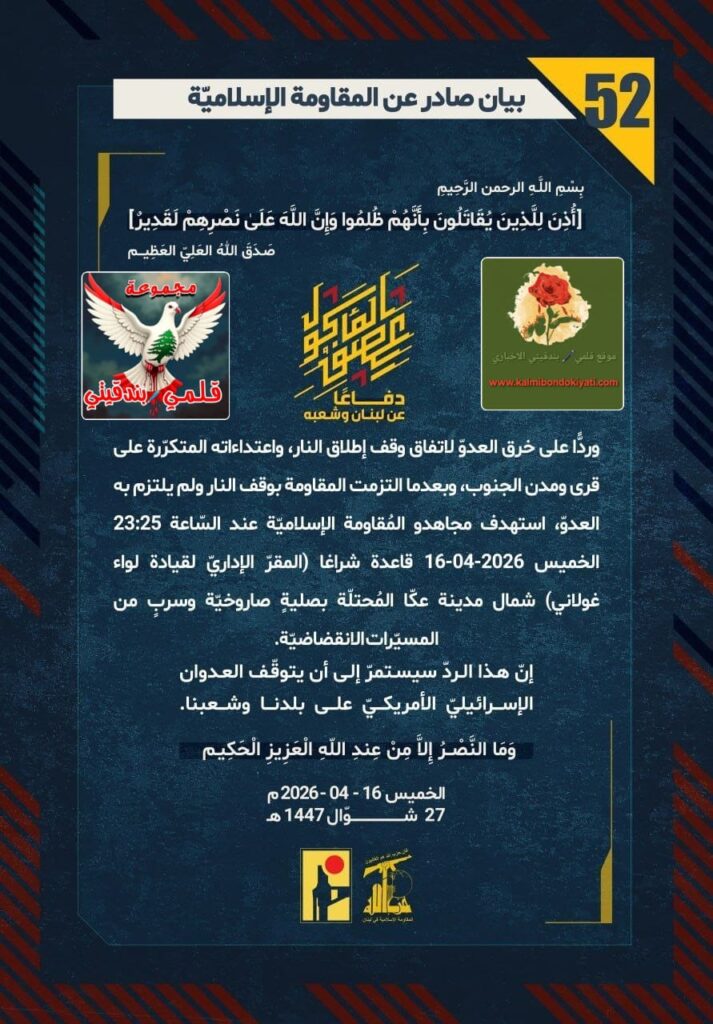 โ๐ ุตุฏุฑ ุจูุงู ุฑูู (52) ููู ูุงูู ุฉ ุงูุฅุณูุงู ูุฉ ุงูุขุชู ูุตู: “ุฏูุงุนูุง ุนู ูุจูุงู ูุดุนุจูุ ูุฑุฏููุง ุนูู ุฎุฑู ุงูุนุฏูู ูุงุชูุงู ููู ุฅุทูุงู ุงููุงุฑุ ูุงุนุชุฏุงุกุงุชู ุงูู ุชูุฑูุฑุฉ ุนูู ูุฑู ูู ุฏู ุงูุฌููุจุ ูุจุนุฏู ุง ุงูุชุฒู ุช ุงูู ูุงูู ุฉ ุจููู ุงููุงุฑ ููู ููุชุฒู ุจู ุงูุนุฏููุ ุงุณุชูุฏู ู ุฌุงูุฏู ุงูู ููุงูู ุฉ ุงูุฅุณูุงู ููุฉ ุนูุฏ ุงูุณูุงุนุฉ 23:25 ุงูุฎู ูุณ 16-04-2026 ูุงุนุฏุฉ ุดุฑุงุบุง (ุงูู ูุฑู ุงูุฅุฏุงุฑูู ูููุงุฏุฉ ููุงุก ุบููุงูู) ุดู ุงู ู ุฏููุฉ ุนููุง ุงูู ูุญุชููุฉ ุจุตููุฉู ุตุงุฑูุฎููุฉ ูุณุฑุจู ู ู ุงูู ุณููุฑุงุช ุงูุงููุถุงุถููุฉ.”