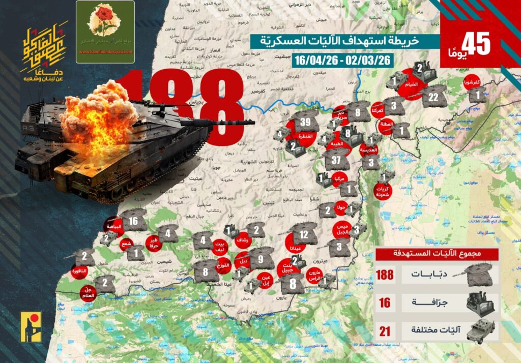 وفي سياق متصل تم نشر خريطة توضح عدد الآليات العسكرية التابعة لجيش العدو “الإسرائيلي” التي استهدفها مجاهدو المقاومة الإسلامية في مختلف ساحات المواجهة في جنوب لبنان خلال معركة العصف المأكول من تاريخ 02-03-2026 حتى 16-04-2026.