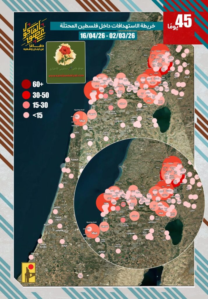 كما نشر خريطة توضح الاستهدافات التي نفّذها مجاهدو المقاومة الإسلامية باتجاه الأراضي الفلسطينية المحتلة باستخدام الصواريخ والمسيّرات الانقضاضيّة خلال معركة العصف المأكول من تاريخ 02-03-2026 حتى 16-04-2026.
