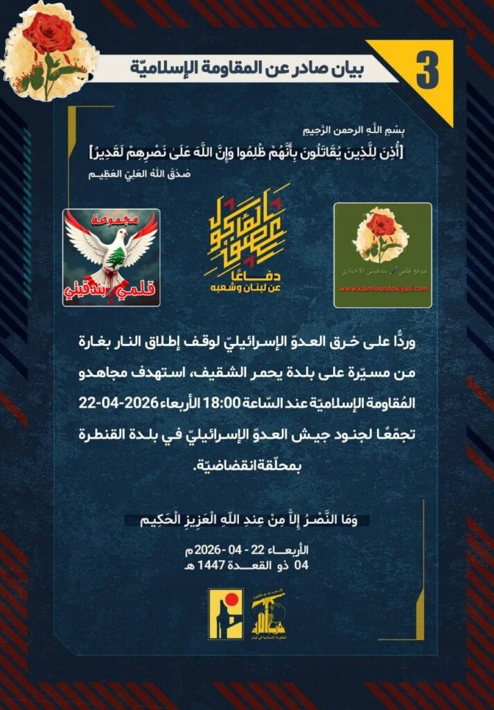 🛑أصدرت المقاومة الاسلامية بعد البيان رقم مباشرة(2) بيان رقم (3) :”دفاعًا عن لبنان وشعبه، وردًّا على خرق العدوّ الإسرائيليّ لوقف إطلاق النار بغارة من مسيّرة على بلدة يحمر الشقيف، استهدف مجاهدو المُقاومة الإسلاميّة عند السّاعة 18:00 الأربعاء 22-04-2026 تجمّعًا لجنود جيش العدوّ الإسرائيليّ في بلدة القنطرة بمحلّقة انقضاضيّة.