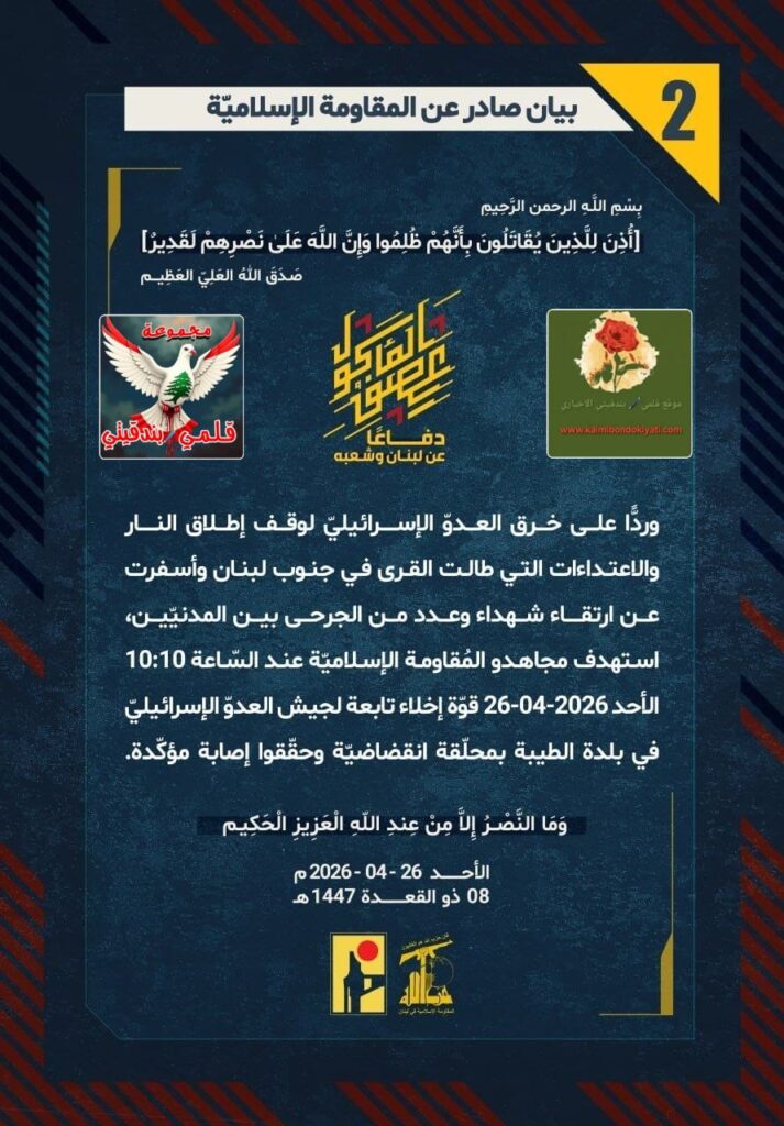 أما البيان العسكري الثاني فجاء فيه: ”دفاعًا عن لبنان وشعبه وردًّا على خرق العدوّ الإسرائيليّ لوقف إطلاق النار والاعتداءات التي طالت القرى في جنوب لبنان وأسفرت عن ارتقاء شهداء وعدد من الجرحى بين المدنيّين، استهدف مجاهدو المُقاومة الإسلاميّة عند السّاعة 10:10 الأحد 26-04-2026 قوّة إخلاء تابعة لجيش العدوّ الإسرائيليّ في بلدة الطيبة بمحلّقة انقضاضيّة وحقّقوا إصابة مؤكّدة.”