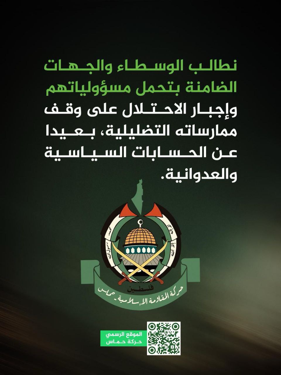 أضاف البيان:” نطالب الوسطاء والجهات الضامنة بتحمل مسؤولياتهم وإجبار الاحتلال على وقف ممارساته التضليلية، بعيدا عن الحسابات السياسية والعدوانية.”