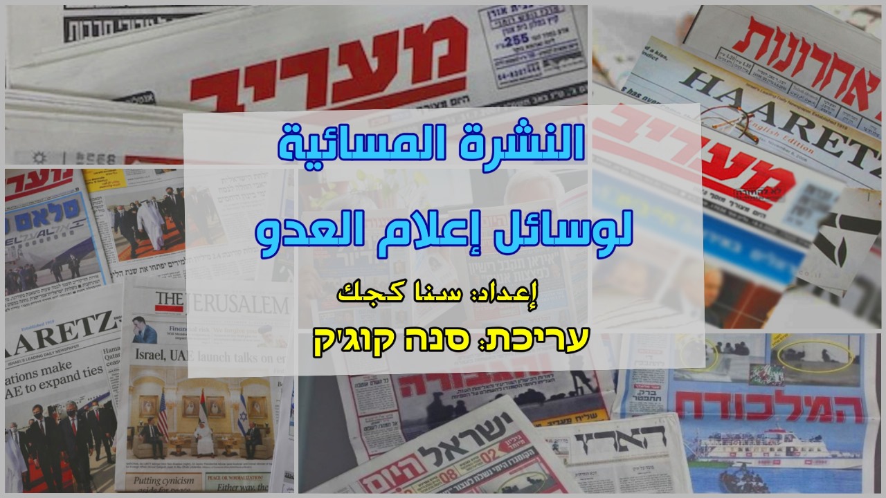 يقدم موقع قلمي🖊️ بندقيتي الاخباري نشرته المسائية الموجزة لآخر التطورات والمستجدات الخاصة بأخبار الكيان المحتل من صحف ومواقع وقنوات واذاعات أبرز ما تضمنته: