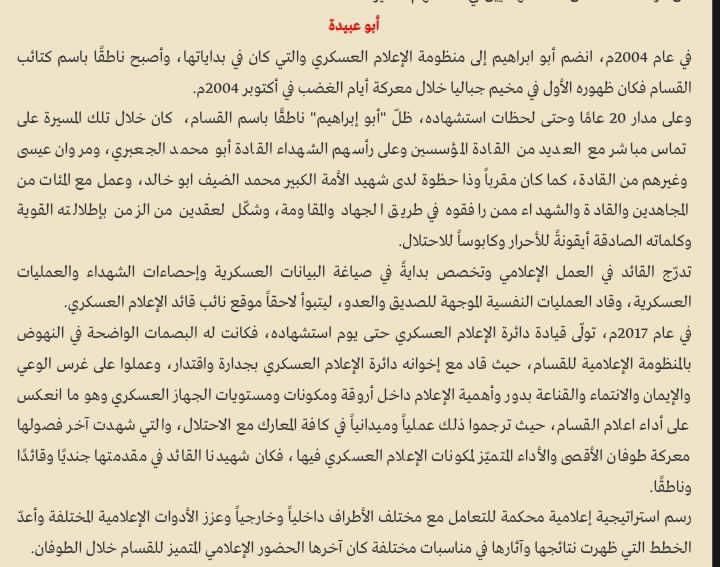 تحت عنوان “خاص القسام” نشرت قناة وموقع كتائب عز الدين القسام عن سيرة”«أبو عبيدة» قائدُ إعلام القسّام وصوتُ الأمة الهادر عن سيرته الذاتية وانضمامه إلى صفوف القسام حتى تاريخ استشهاده..