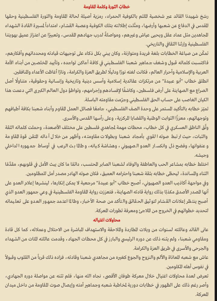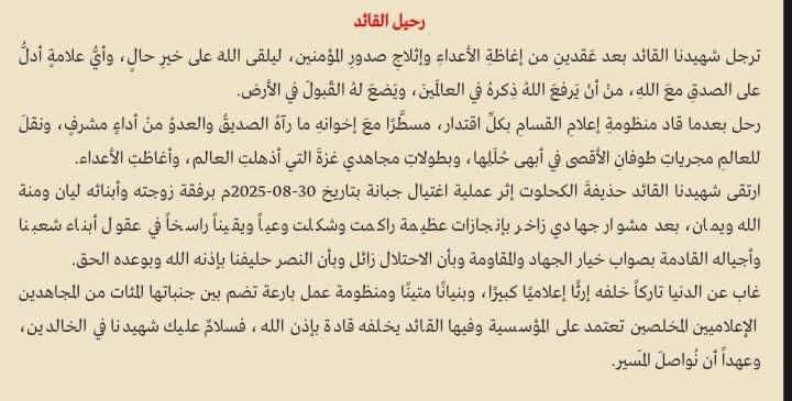 “ألهم بصوته القوي وكلماته الصادقة الملايين، وتلهفت جماهير المقاومة في أصقاع الأرض لسماع خطاباته وكلماته، وظلّ نبضُ فلسطين في صوتِه، يحملُ أملًا ونورًا لأبناء شعبنا وأمتنا، ونارًا ورعبًا للعدو الصهيوني وقطعان مغتصبيه. …نقل رسالة المقاومة بكوفيته الحمراء لسنوات طويلة، وزفّ بشريات العمليات الشهيرة مبشّرًا الأسرى بالحرية المنتظرة ليكون وعدًا محققًا بفضل الله، كما نقل مجريات الميدان للعالم، وعرّى إجرام قادة العدو وجنوده، وأقام الحجّة على الأمة العربية والإسلامية. …إنه الشهيد القائد الكبير حذيفة سمير عبد الله الكحلوت “أبو إبراهيم”، الناطق باسمِ كتائبِ القسام، المكنى “أبو عبيدة”، صوتُ الأمّةِ الهادِر، ورجلُ الكلمةِ والموقف، نبضُ فلسطينَ وقُدسِها وشعبِها ومُقاومِيها، هذا الفارسُ، الذي لمْ ينقطعْ عن شعبه في أحلكِ الظروف، خاطَبَهُمْ منْ قلبِ المعركة، يُبشرُهُمْ ويُصبِّرهمْ ويُواسِيهِمْ، ولطالما انتظرَهُ جمهورُ العدوِ قبلَ أبناءِ شعبِهِ، ليسمعوا منهُ فصلَ الخطابِ والخبرَ اليقين.