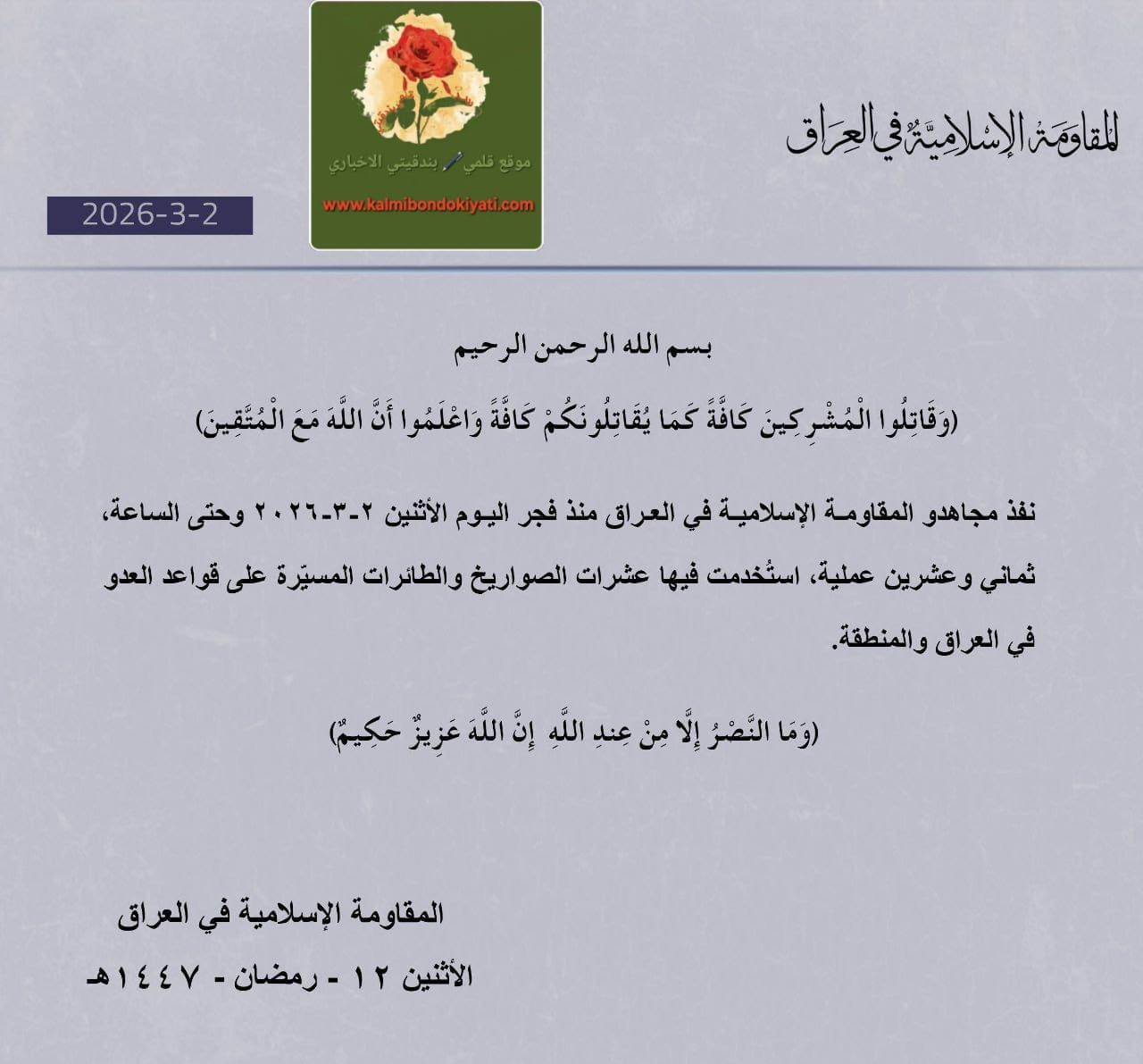 أصدرت المقاومة الاسلامية في العراق البيان التالي:”نفذ مجاهدو المقاومة الإسلامية في العراق منذ فجر اليوم الأثنين ٢-٣-٢٠٢٦ وحتى الساعة، ثماني وعشرين عملية استُخدمت فيها عشرات الصواريخ والطائرات المسيّرة على قواعد العدو في العراق والمنطقة.