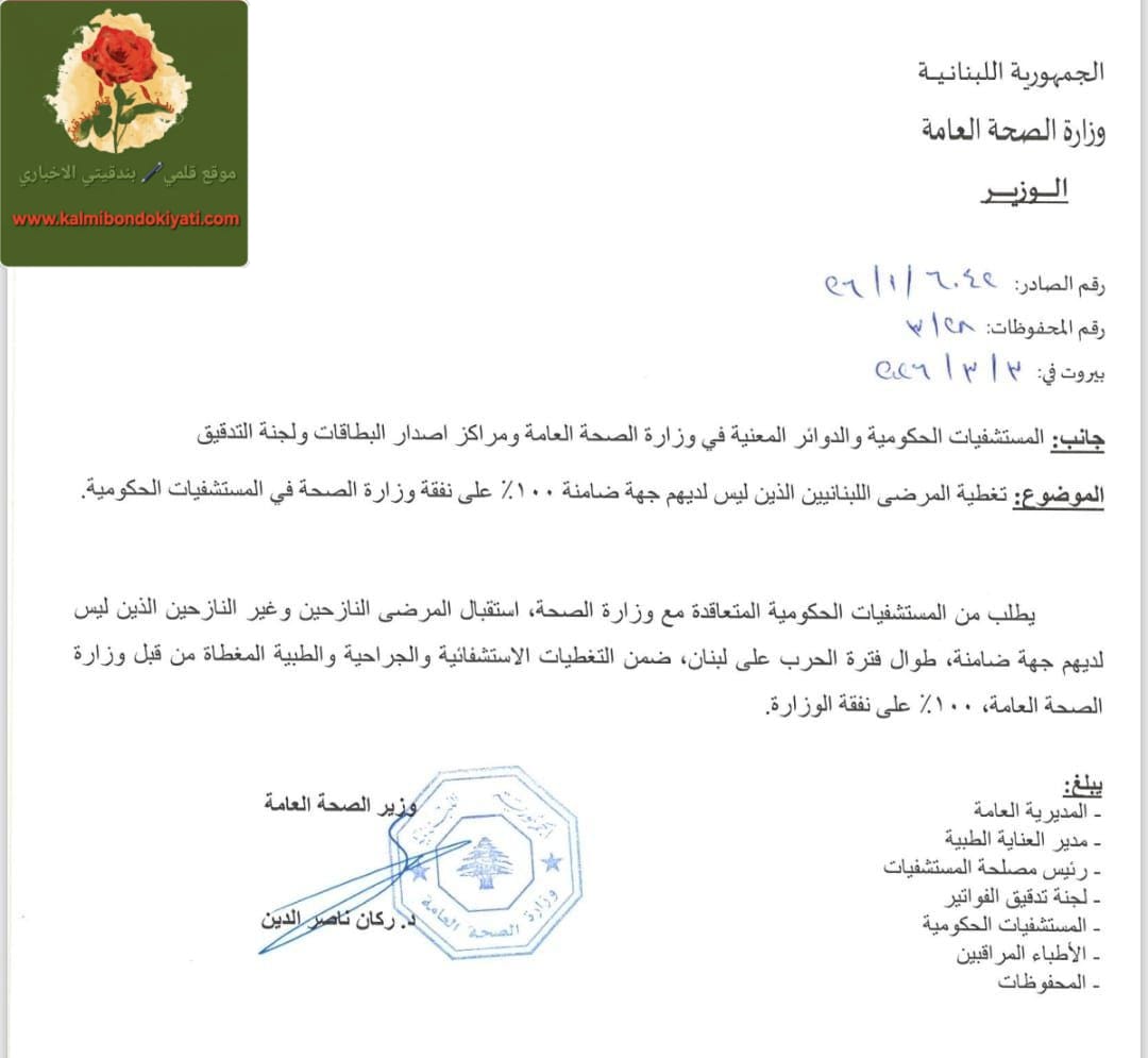 أصدرت وزارة الصحة اللبنانية قرار يعد تاريخيا” لما فيه راحة لصحة المواطن اللبناني اذ اعلنت عن تغطية جميع المرضى اللبنانيين النازحين وغير النازحين الذين ليس لديهم جهة ضامنة ١٠٠% على نفقة وزارة الصحة في المستشفيات الحكومية طوال فترة الحرب على لبنان.