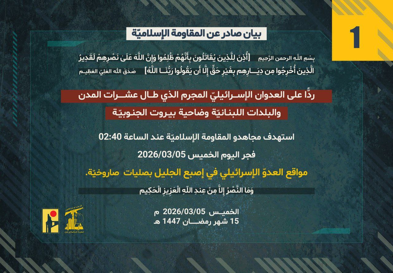 صدر البيان رقم 1 للمقاومة الاسلامية صباح اليوم الخميس 5 مارس جاء فيه:”ردًّا على العدوان الإسرائيلي المجرم الذي طال عشرات المدن والبلدات اللبنانيّة بما فيها ضاحية بيروت الجنوبيّة، استهدف مجاهدو المقاومة الإسلاميّة عند الساعة 02:40 من فجر اليوم الخميس 05/03/2026 مواقع العدوّ الإسرائيلي في اصبع الجليل بصليات صاروخيّة.”