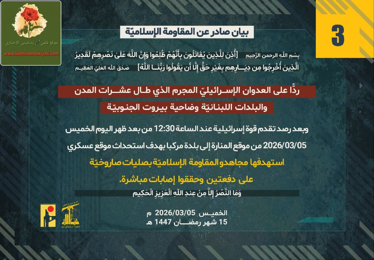 صدر بيان رقم (3) للمقاومة الاسلامية الآتي نصه:”ردًّا على العدوان الإسرائيلي المجرم الذي طال عشرات المدن والبلدات اللبنانيّة بما فيها ضاحية بيروت الجنوبيّة، وبعد رصد تقدم قوة إسرائيلية عند الساعة 12:30 من بعد ظهر اليوم الخميس 05/03/2026 من موقع المنارة إلى بلدة مركبا بهدف استحداث موقع عسكري، استهدفها مجاهدو المقاومة الإسلاميّة بصليات صاروخيّة على دفعتين وحققوا إصابات مباشرة.