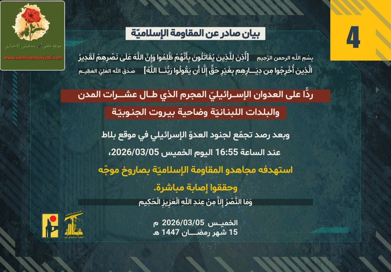 صدر بيان رقم (4) للمقاومة الاسلامية الآتي نصه:”ردًّا على العدوان الإسرائيلي المجرم الذي طال عشرات المدن والبلدات اللبنانيّة بما فيها ضاحية بيروت الجنوبيّة، وبعد رصد تجمّعٍ لجنود العدوّ الإسرائيلي في موقع بلاط عند الساعة 16:55 من عصر اليوم الخميس 05/03/2026، استهدفه مجاهدو المقاومة الإسلاميّة بصاروخ موجّه وحققوا إصابة مباشرة.