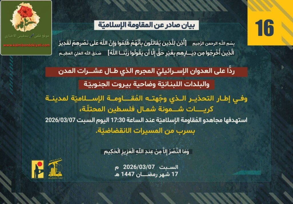 ุตุฏุฑ ุจูุงู ุฑูู “15” ููู ูุงูู ุฉ ุงูุงุณูุงู ูุฉ ุงูุขุชู ูุตู:”ุฑุฏููุง ุนูู ุงูุนุฏูุงู ุงูุฅุณุฑุงุฆููู ุงูู ุฌุฑู ุงูุฐู ุทุงู ุนุดุฑุงุช ุงูู ุฏู ูุงูุจูุฏุงุช ุงููุจูุงูููุฉ ุจู ุง ูููุง ุถุงุญูุฉ ุจูุฑูุช ุงูุฌููุจููุฉุ ููู ุฅุทุงุฑ โุงูุชุญุฐูุฑ ุงูุฐู ูุฌููุชู ุงูู ููุงูู ุฉ ุงูุฅุณูุงู ููุฉ ูู ุฏููุฉ ููุงุฑูุง ุงูู ุญุชูุฉ ุดู ุงู ููุณุทูู ุงูู ุญุชูุฉุ ุงุณุชูุฏููุง ู ุฌุงูุฏู ุงูู ููุงูู ุฉ ุงูุฅุณูุงู ููุฉ ุนูุฏ ุงูุณุงุนุฉ 13:40 ุงูููู ุงูุณุจุช 07/03/2026 ุจุณุฑุจู ู ู ุงูู ุณููุฑุงุช ุงูุงููุถุงุถููุฉ.