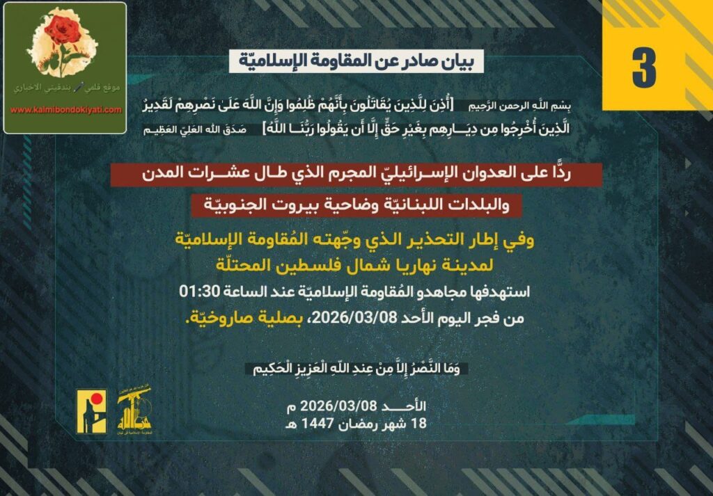 أصدرت المقاومة الاسلامية بعد البيان رقم (2) مباشرة بيان رقم(3):”ردًّا على العدوان الإسرائيلي المجرم الذي طال عشرات المدن والبلدات اللبنانيّة وضاحية بيروت الجنوبيّة، وفي إطار التحذير الذي وجّهته المُقاومة الإسلاميّة لمدينة نهاريا شمال فلسطين المحتلّة، استهدفها مجاهدو المُقاومة الإسلاميّة عند الساعة 01:30 من فجر اليوم الأحد 08/03/2026 بصلية صاروخيّة.