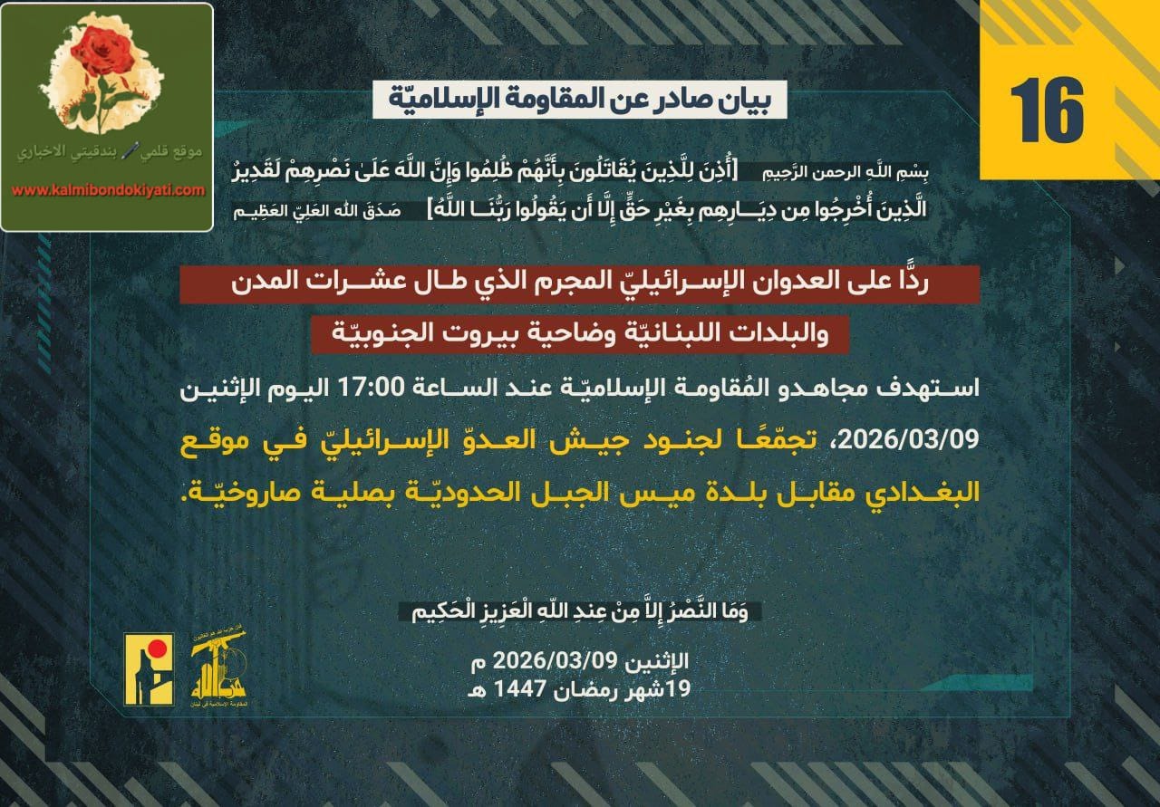 ุตุฏุฑ ุจูŠุงู† ุฑู‚ู… “16” ู„ู„ู…ู‚ุงูˆู…ุฉ ุงู„ุงุณู„ุงู…ูŠุฉ ุงู„ุขุชูŠ ู†ุตู‡:”ุฑุฏู‘ู‹ุง ุนู„ู‰ ุงู„ุนุฏูˆุงู† ุงู„ุฅุณุฑุงุฆูŠู„ูŠ ุงู„ู…ุฌุฑู… ุงู„ุฐูŠ ุทุงู„ ุนุดุฑุงุช ุงู„ู…ุฏู† ูˆุงู„ุจู„ุฏุงุช ุงู„ู„ุจู†ุงู†ูŠู‘ุฉ ูˆุถุงุญูŠุฉ ุจูŠุฑูˆุช ุงู„ุฌู†ูˆุจูŠู‘ุฉุŒ ุงุณุชู‡ุฏู ู…ุฌุงู‡ุฏูˆ ุงู„ู…ูู‚ุงูˆู…ุฉ ุงู„ุฅุณู„ุงู…ูŠู‘ุฉ ุนู†ุฏ ุงู„ุณุงุนุฉ 17:00 ู…ู† ุนุตุฑ ุงู„ูŠูˆู… ุงู„ุฅุซู†ูŠู† 09/03/2026 ุชุฌู…ู‘ุนู‹ุง ู„ุฌู†ูˆุฏ ุฌูŠุด ุงู„ุนุฏูˆู‘ ุงู„ุฅุณุฑุงุฆูŠู„ูŠู‘ ููŠ ู…ูˆู‚ุน ุงู„ุจุบุฏุงุฏูŠ ู…ู‚ุงุจู„ ุจู„ุฏุฉ ู…ูŠุณ ุงู„ุฌุจู„ ุงู„ุญุฏูˆุฏูŠู‘ุฉ ุจุตู„ูŠุฉ ุตุงุฑูˆุฎูŠู‘ุฉ.