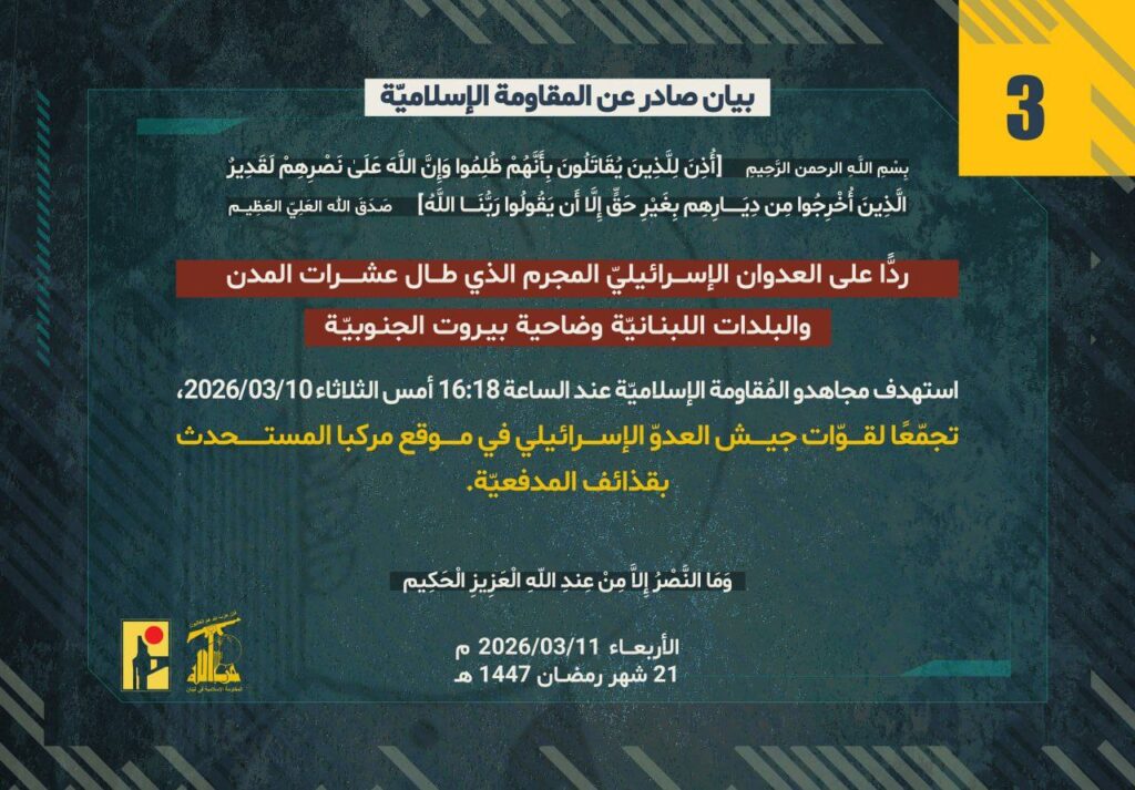 “ردًّا على العدوان الإسرائيلي المجرم الذي طال عشرات المدن والبلدات اللبنانيّة بما فيها ضاحية بيروت الجنوبيّة، استهدف مجاهدو المقاومة الإسلامية عند الساعة 16:18 أمس الثلاثاء 10/03/2026 تجمّعًا لقوّات جيش العدو الإسرائيلي في موقع مركبا المستحدث بقذائف المدفعيّة.”