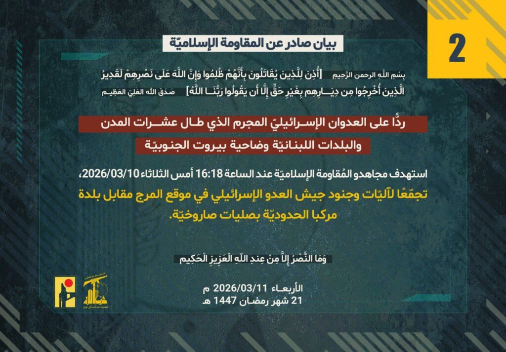 “ردًّا على العدوان الإسرائيلي المجرم الذي طال عشرات المدن والبلدات اللبنانيّة وضاحية بيروت الجنوبيّة استهدف مجاهدو المُقاومة الإسلاميّة عند الساعة 16:18 أمس الثلاثاء 10/03/2026، تجمّعًا لآليّات وجنود جيش العدو الإسرائيلي في موقع المرج مقابل بلدة مركبا الحدوديّة بصليات صاروخيّة.”
