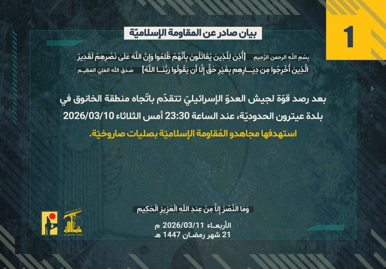 أصدرت المقاومة الاسلامية بياناتها العسكرية ليوم الأربعاء الموافق 11 مارس 2026 وجاء في البيان رقم 1:”بعد رصد قوّة لجيش العدوّ الإسرائيليّ تتقدّم باتّجاه منطقة الخانوق في بلدة عيترون الحدوديّة، عند الساعة 23:30 أمس الثلاثاء 10/03/2026، استهدفها مجاهدو المُقاومة الإسلاميّة بصليات صاروخيّة.”