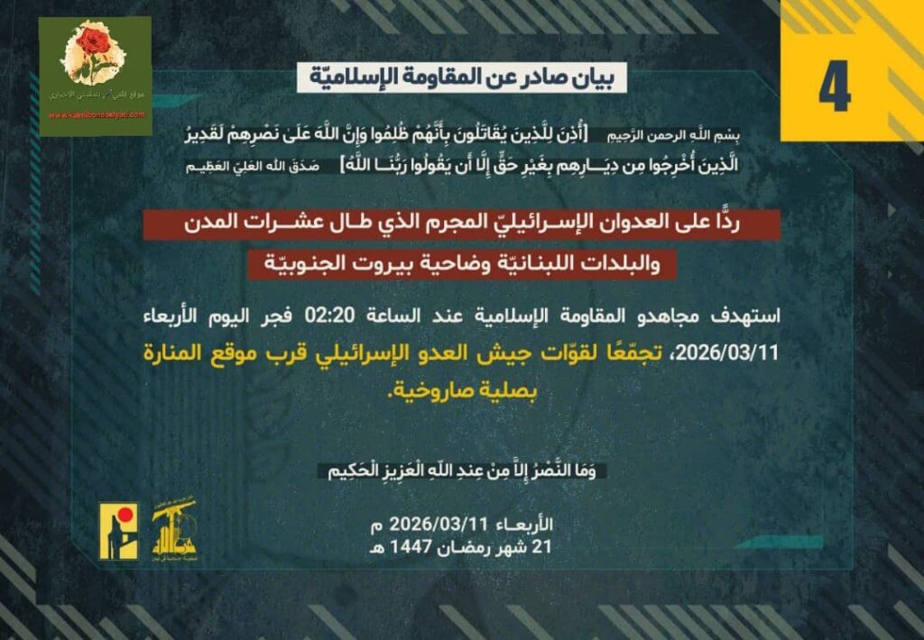 تستمر المقاومة الإسلامية في لبنان بإصدار بياناتها العسكرية وقد أصدرت بيان رقم “4” الآتي نصه:” ردًّا على العدوان الإسرائيلي المجرم الذي طال عشرات المدن والبلدات اللبنانيّة بما فيها ضاحية بيروت الجنوبيّة، استهدف مجاهدو المقاومة الإسلامية عند الساعة 02:20 فجر اليوم الأربعاء 11/03/2026 تجمّعًا لقوّات جيش العدو الإسرائيلي قرب موقع المنارة بصلية صاروخية.”