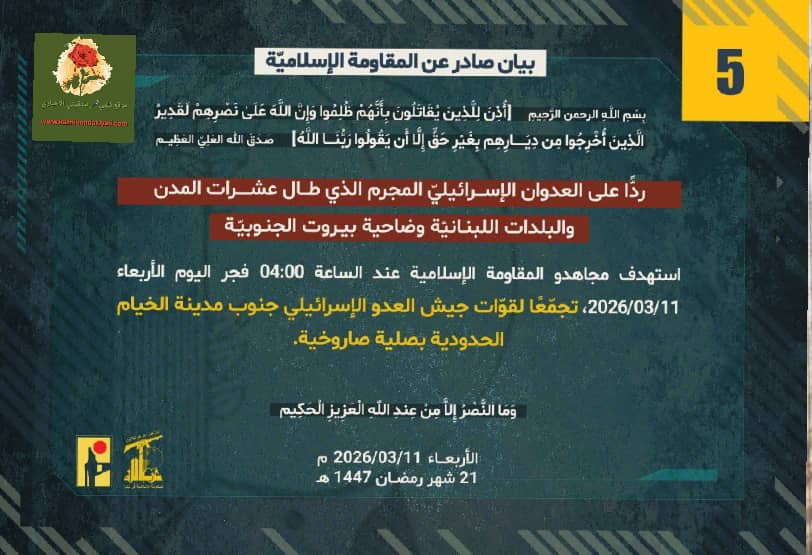 فيما تواصل التنكيل بالعدو تصدر البيان رقم “5” ورد فيه:” ردًّا على العدوان الإسرائيلي المجرم الذي طال عشرات المدن والبلدات اللبنانيّة بما فيها ضاحية بيروت الجنوبيّة استهدف مجاهدو المقاومة الإسلامية عند الساعة 04:00 فجر اليوم الأربعاء 11/03/2026 تجمّعًا لقوّات جيش العدو الإسرائيلي جنوب مدينة الخيام بصلية صاروخية. “