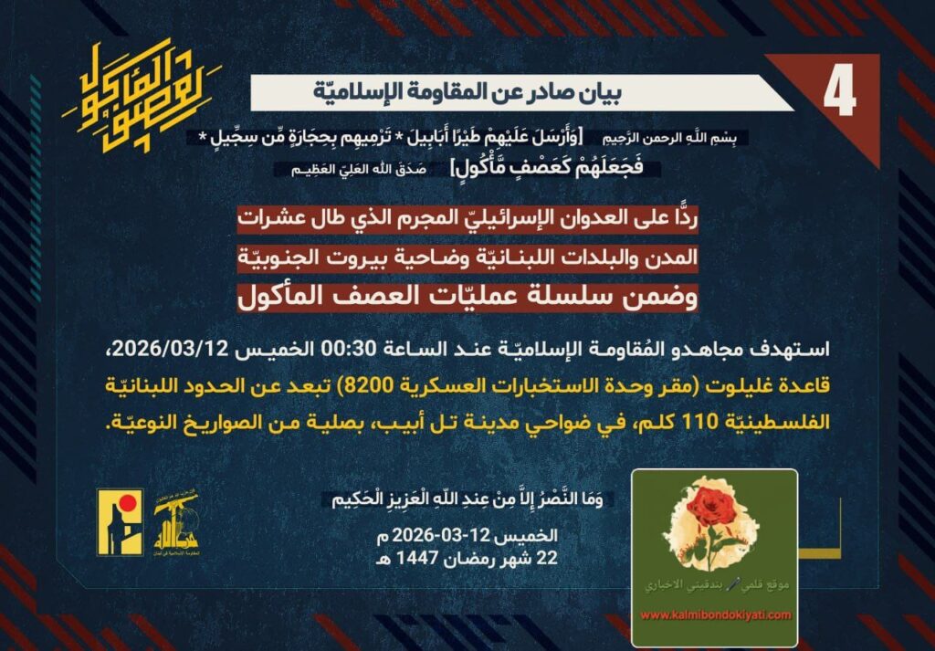 ุฃุตุฏุฑุช ุงู„ู…ู‚ุงูˆู…ุฉ ุงู„ุงุณู„ุงู…ูŠุฉ ุจุนุฏ ุงู„ุจูŠุงู† ุฑู‚ู… (3) ู…ุจุงุดุฑุฉ ุจูŠุงู† ุฑู‚ู… (4) :โ€ุฑุฏู‘ู‹ุง ุนู„ู‰ ุงู„ุนุฏูˆุงู† ุงู„ุฅุณุฑุงุฆูŠู„ูŠ ุงู„ู…ุฌุฑู… ุงู„ุฐูŠ ุทุงู„ ุนุดุฑุงุช ุงู„ู…ุฏู† ูˆุงู„ุจู„ุฏุงุช ุงู„ู„ุจู†ุงู†ูŠู‘ุฉ ูˆุถุงุญูŠุฉ ุจูŠุฑูˆุช ุงู„ุฌู†ูˆุจูŠู‘ุฉุŒ ูˆุถู…ู† ุณู„ุณู„ุฉ ุนู…ู„ูŠู‘ุงุช ุงู„ุนุตู ุงู„ู…ุฃูƒูˆู„ุŒ ุงุณุชู‡ุฏู ู…ุฌุงู‡ุฏูˆ ุงู„ู…ูู‚ุงูˆู…ุฉ ุงู„ุฅุณู„ุงู…ูŠู‘ุฉ ุนู†ุฏ ุงู„ุณุงุนุฉ 00:30 ุงู„ุฎู…ูŠุณ 12/03/2026ุŒ ู‚ุงุนุฏุฉ ุบู„ูŠู„ูˆุช (ู…ู‚ุฑ ูˆุญุฏุฉ ุงู„ุงุณุชุฎุจุงุฑุงุช ุงู„ุนุณูƒุฑูŠุฉ 8200) ุชุจุนุฏ ุนู† ุงู„ุญุฏูˆุฏ ุงู„ู„ุจู†ุงู†ูŠู‘ุฉ ุงู„ูู„ุณุทูŠู†ูŠู‘ุฉ 110 ูƒู„ู…ุŒ ููŠ โ€ุถูˆุงุญูŠ ู…ุฏูŠู†ุฉ ุชู„ ุฃุจูŠุจุŒ ุจุตู„ูŠุฉ ู…ู† ุงู„ุตูˆุงุฑูŠุฎ ุงู„ู†ูˆุนูŠู‘ุฉ.